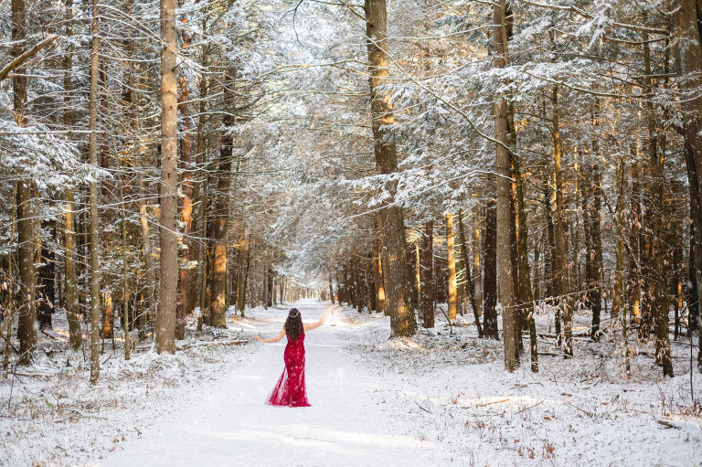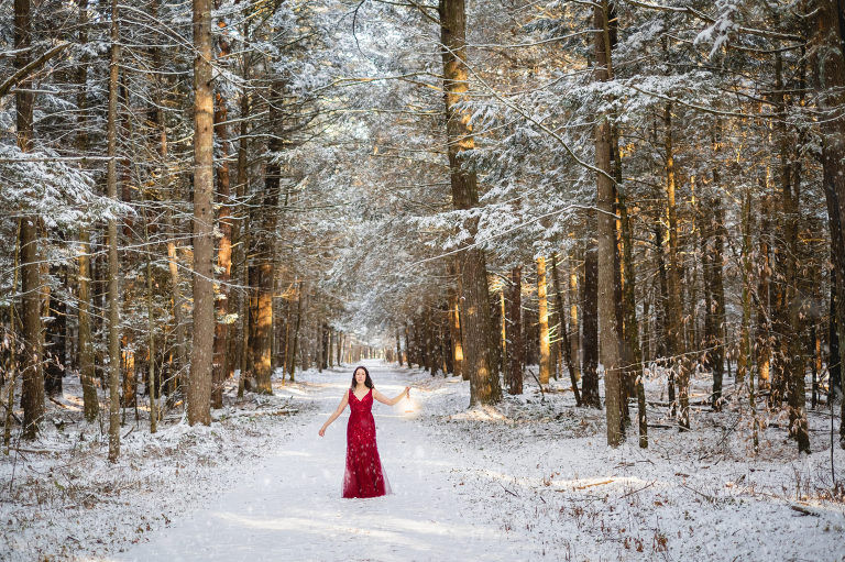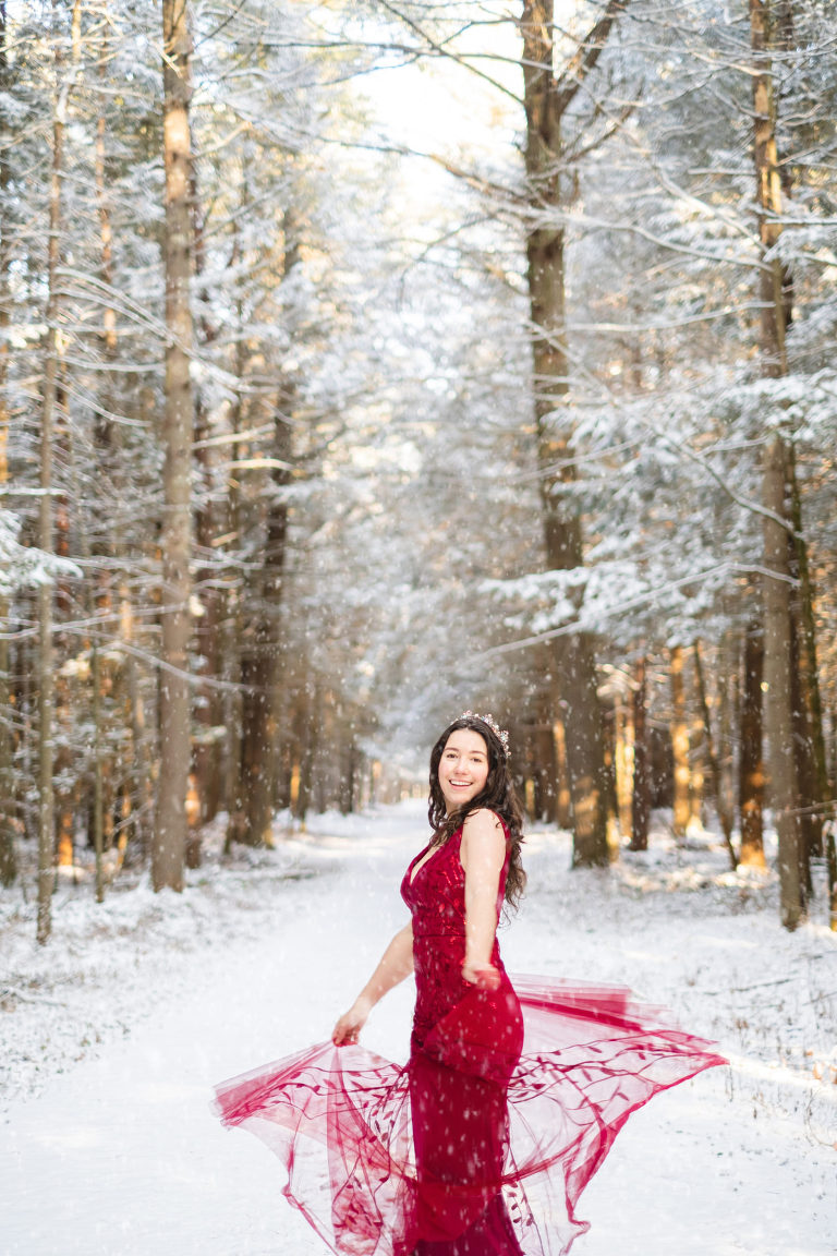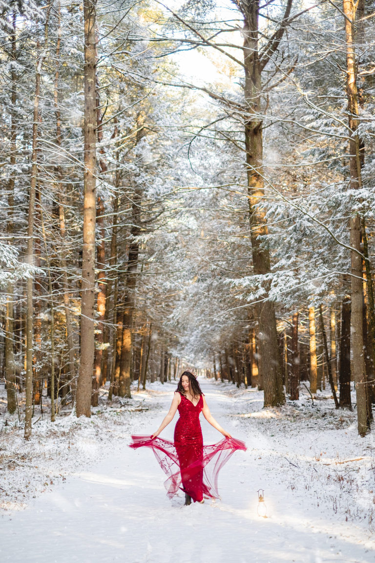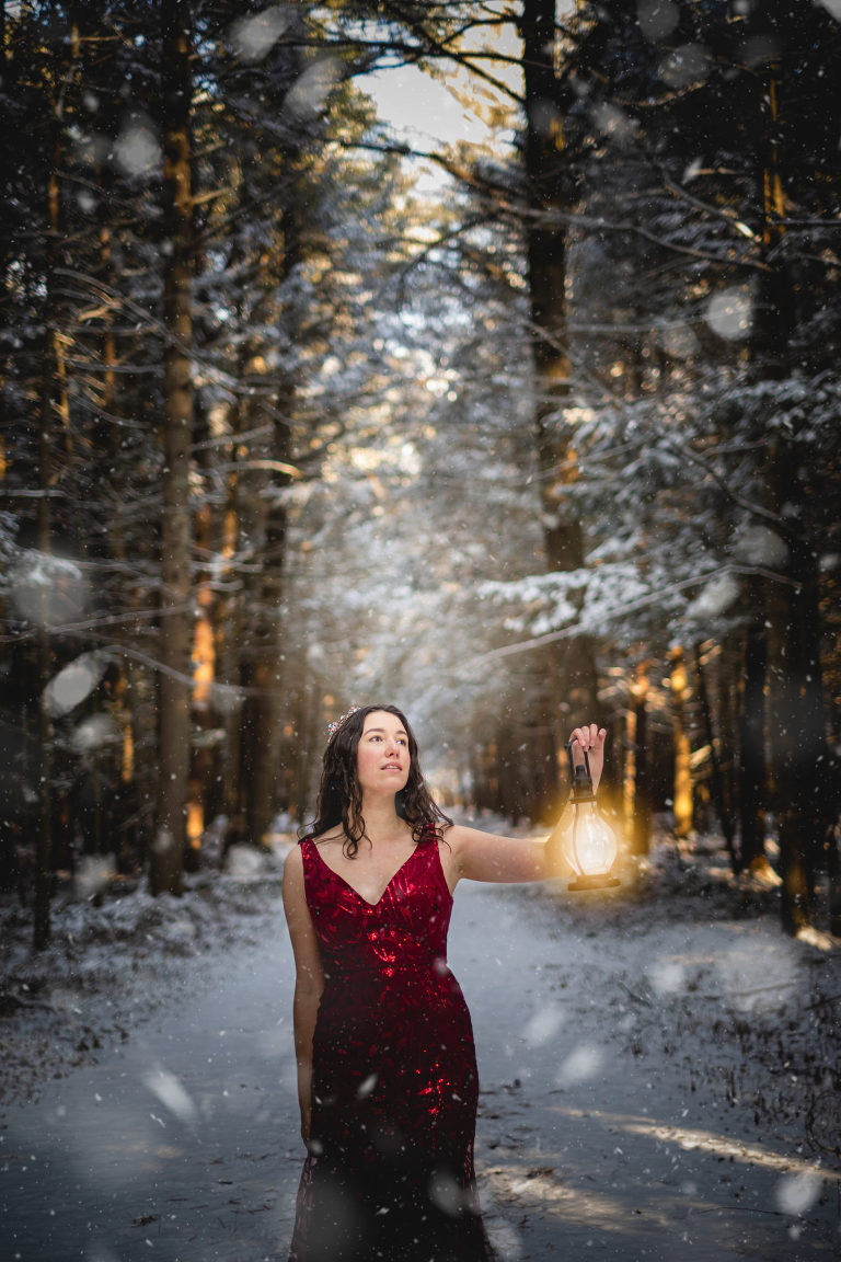 “You can wear a red coat and it will pop out against the snow, ” Matthew told me. It sparked an idea. Not a red coat, but that red dress I’ve had in my closet. And that beautiful crown I’ve been holding onto for photo shoots and haven’t used yet. I could also bring a lantern and pretend to be a wanderer in the snowy woods. Since the end of last year I’ve been trying to just get creative and so self portraits for the sake of learning to pose, getting more confident on the other side of the camera, and just for creative fun. It was chilly, but being December it wasn’t as cold as January or February so it was manageable. I drove down the road to my favorite old carriage road in the woods and set up my tripod.