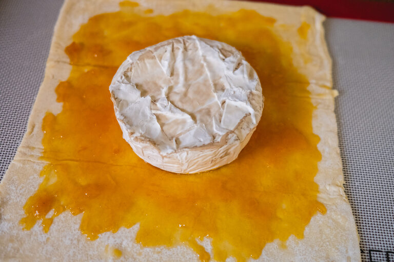 When your puff pastry is at room temperature, lay it out on a baking sheet or baking mat. Add a thin layer of Trader Joe’s pumpkin spread (or your favorite jam or fig sauce) to the puff pastry and put your full brie in the center.