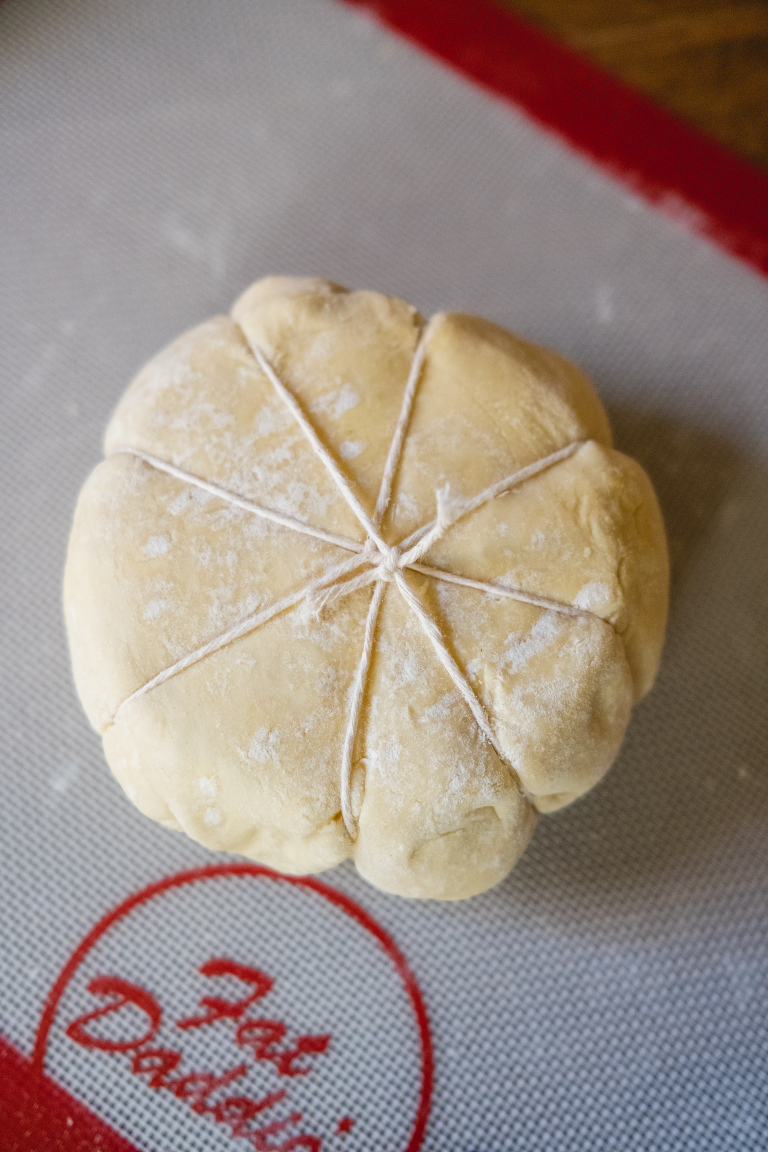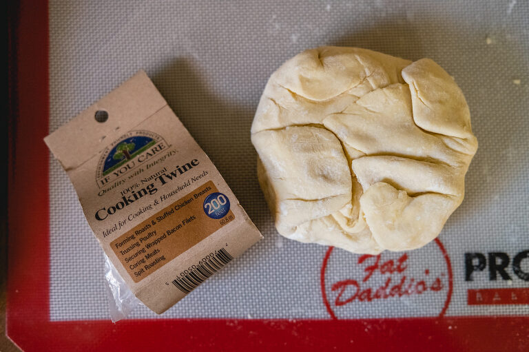 Wrap your baking twine four times around to make a pumpkin shape and tie it tightly without ripping the puff pastry.