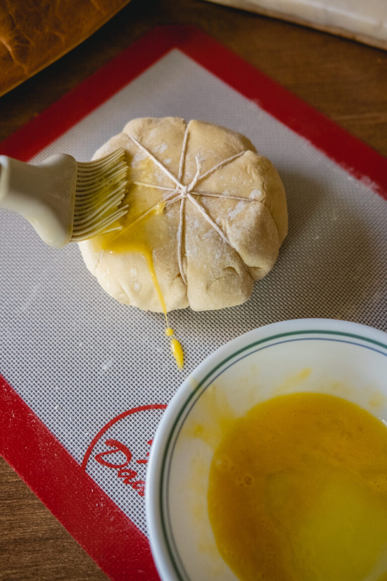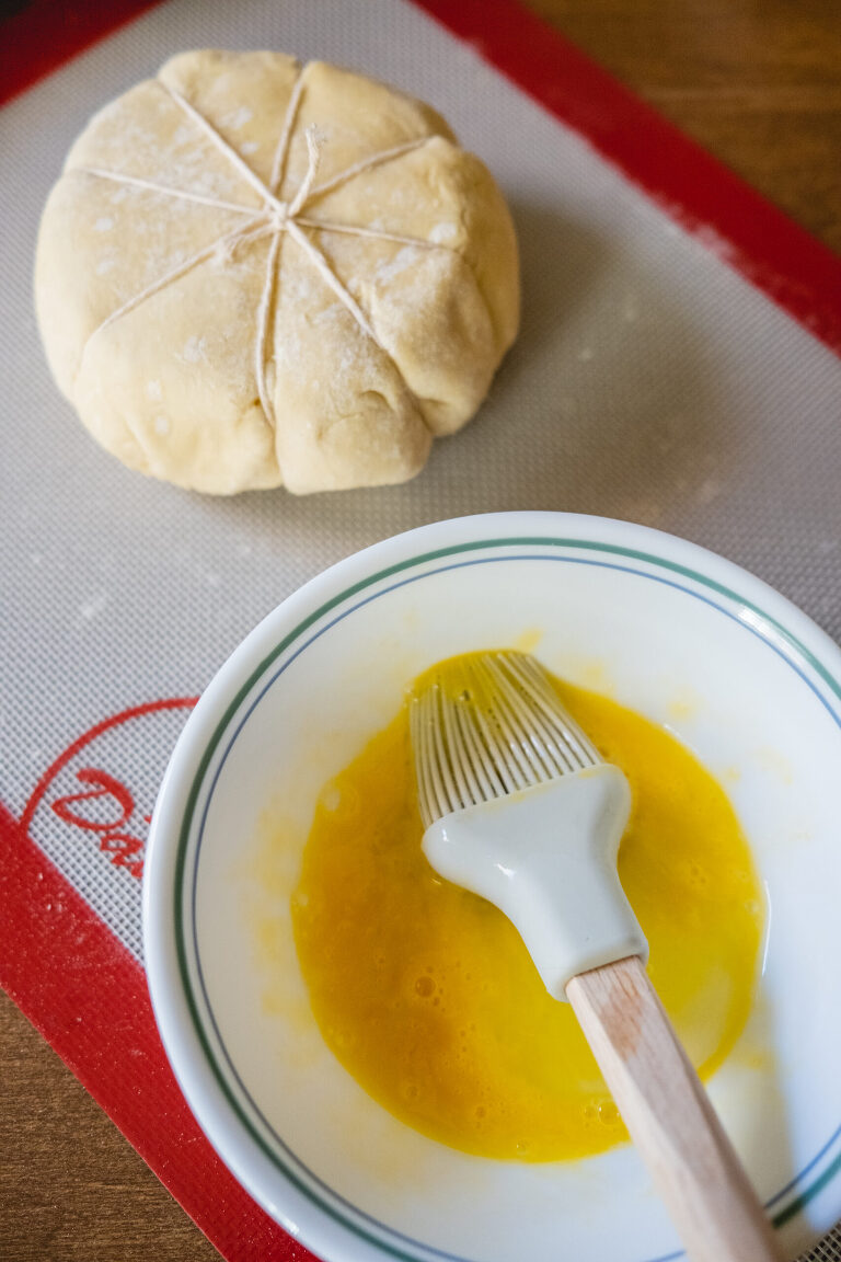Scramble up your egg to brush on a thin egg layer to your puff pastry covered brie. This will give it that lovely golden color when baked.