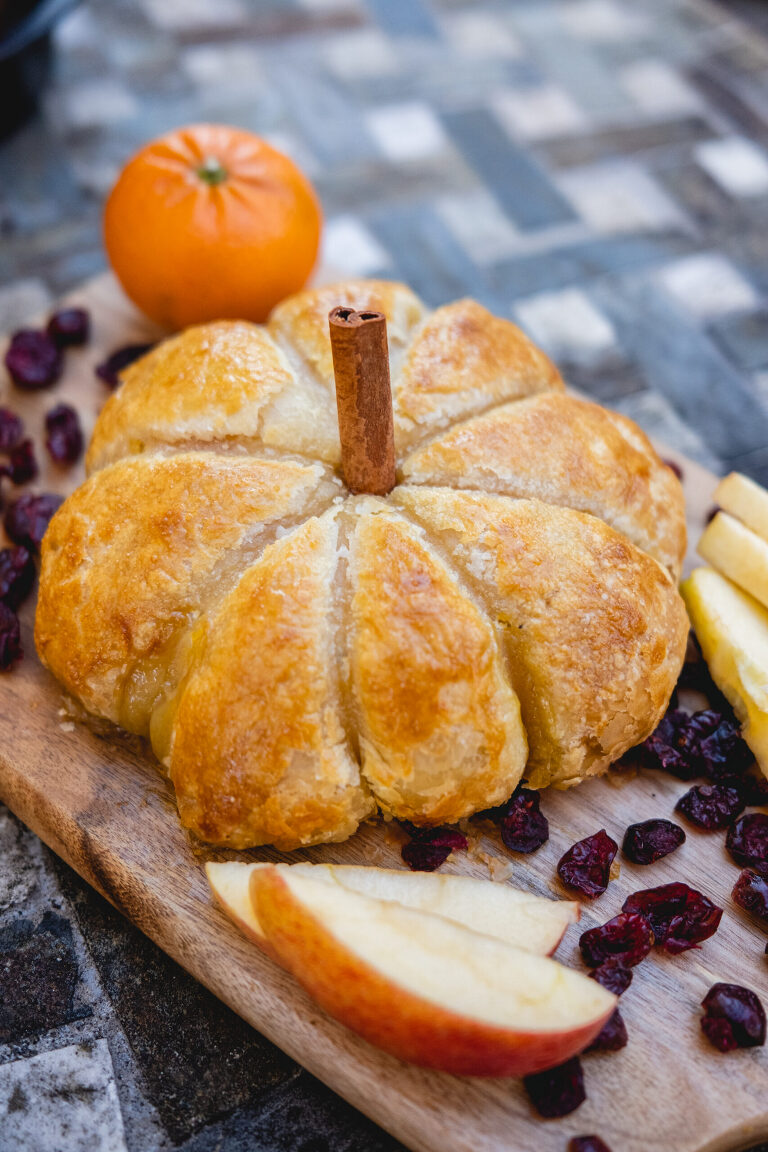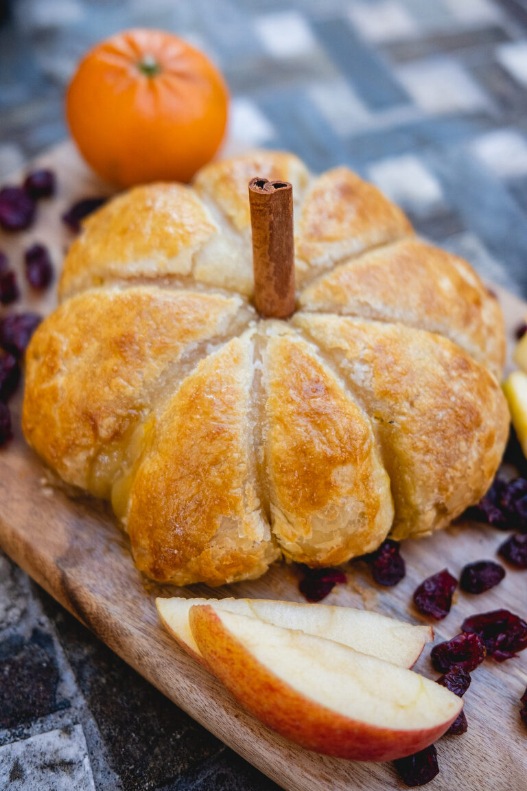 I often make baked bries around the holidays and add my favorite fig sauce. The only difference with this recipe is using baking twine around the puff pastry to shape it into a pumpkin.