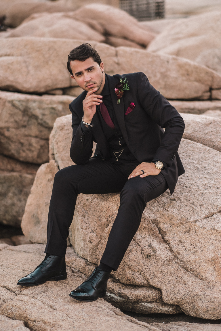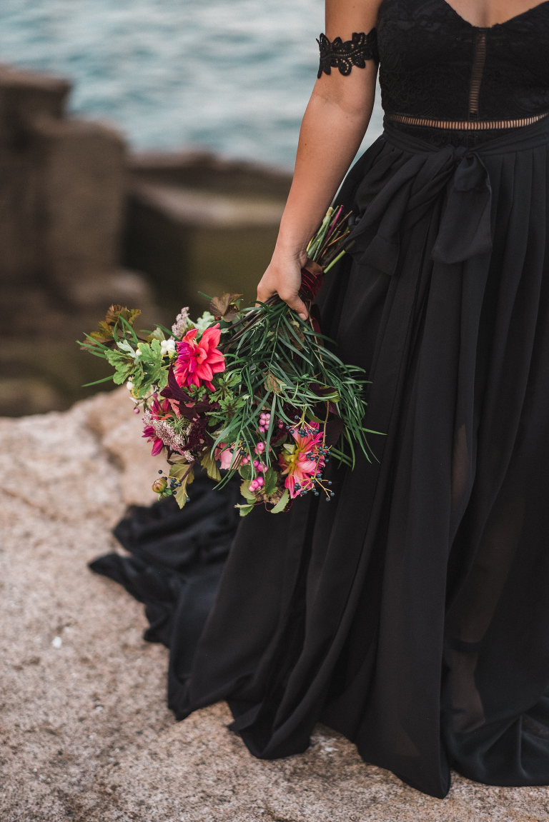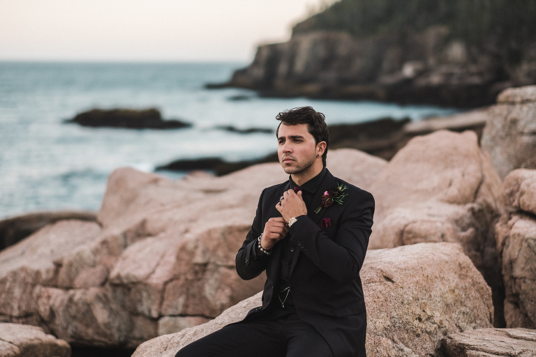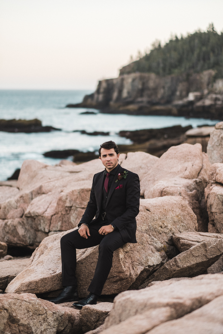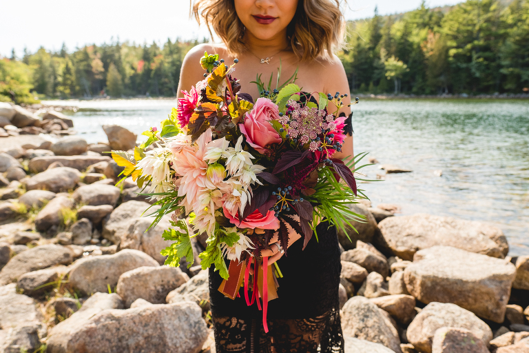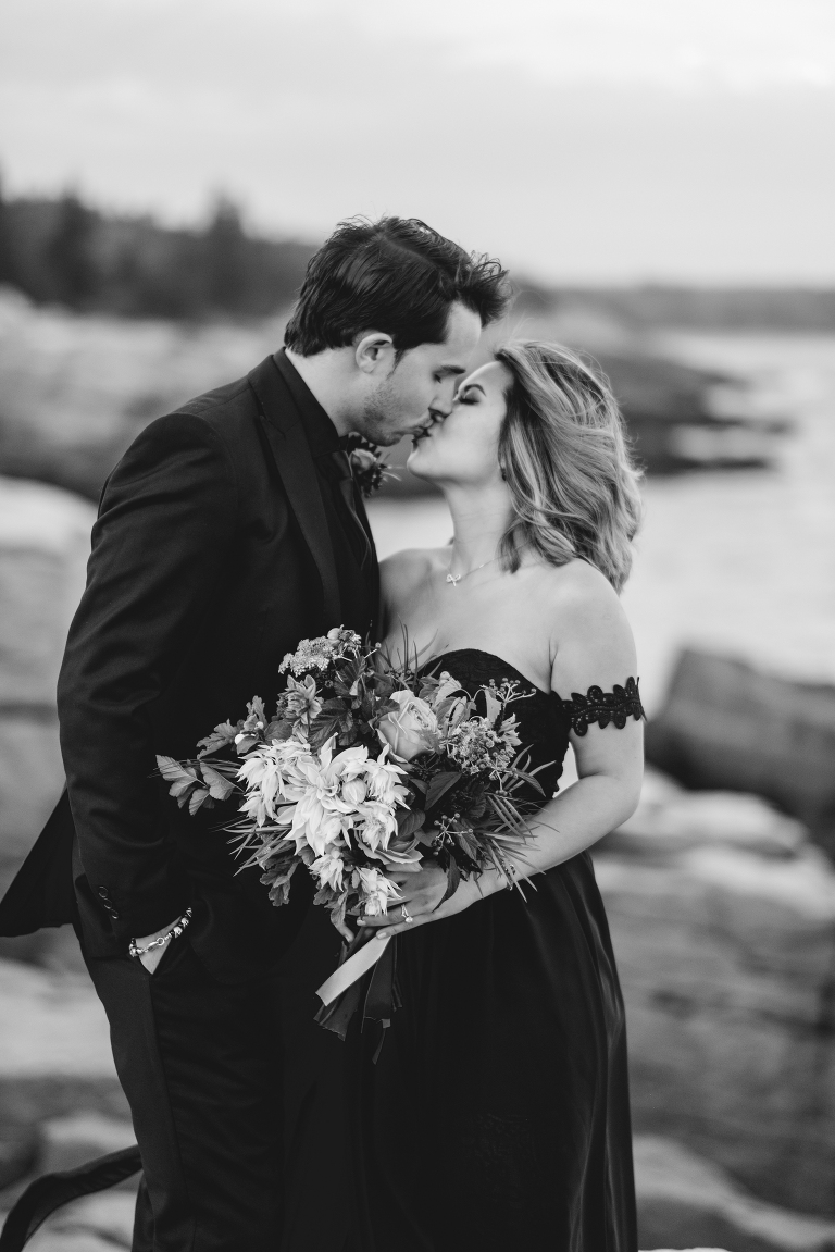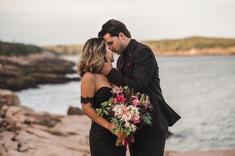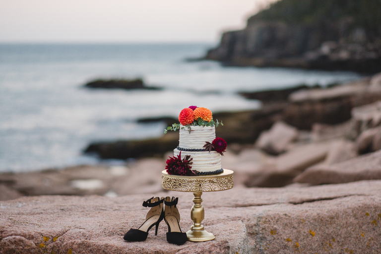 Most of all, I am especially grateful to the very talented local wedding vendors that devoted their creativity and talents to making this photo shoot truly spectacular. Jacqueline of Affectionate Confections made this extraordinary cake (almond and raspberry!) for the style shoot. The beautiful bouquet and boutonniere were created by the talented Beth of Floret. I told Beth and Jacqueline my ideas for the photo shoot, the colors, and the theme, and they invented these incredible designs with their amazing imaginations. If you are looking for a florist or wedding cake baker near Bar Harbor or Acadia, I could not recommend working with these two ladies enough. They will take your vision for your special day and turn it into more than you ever dreamed of.