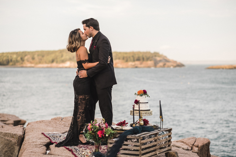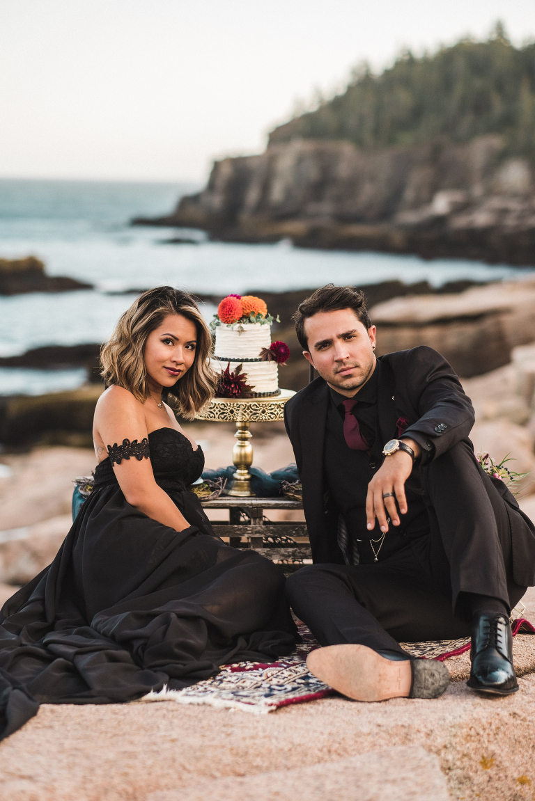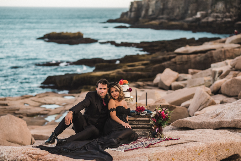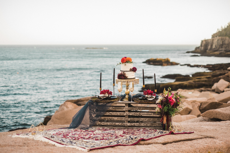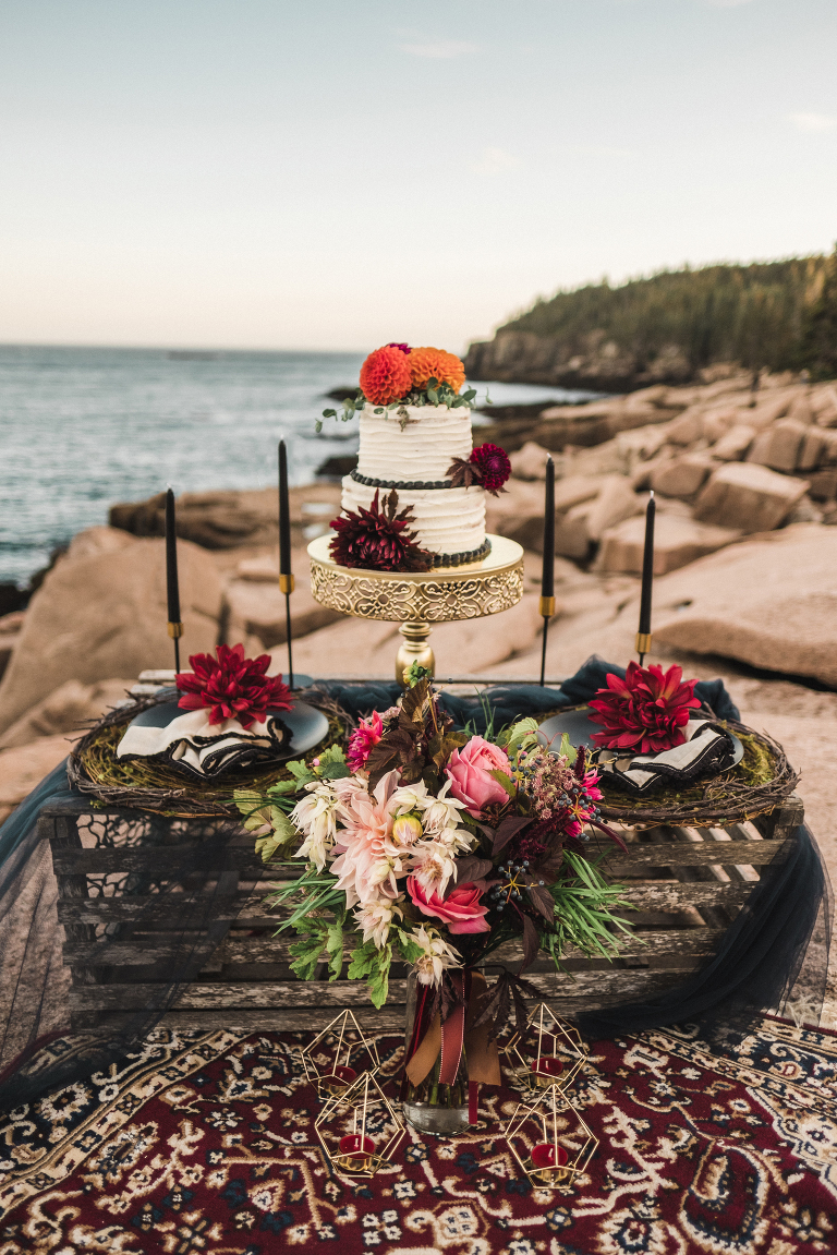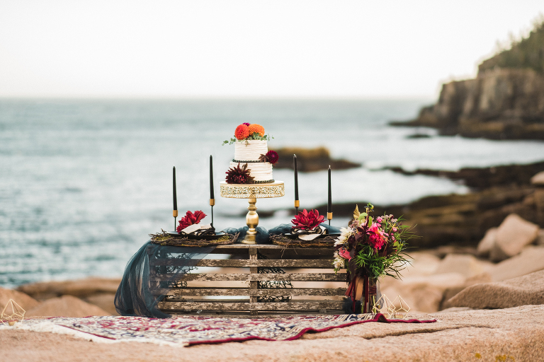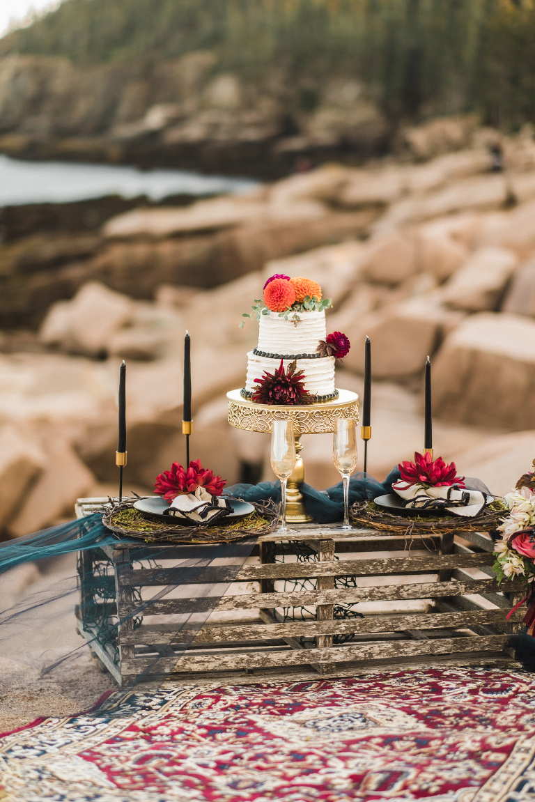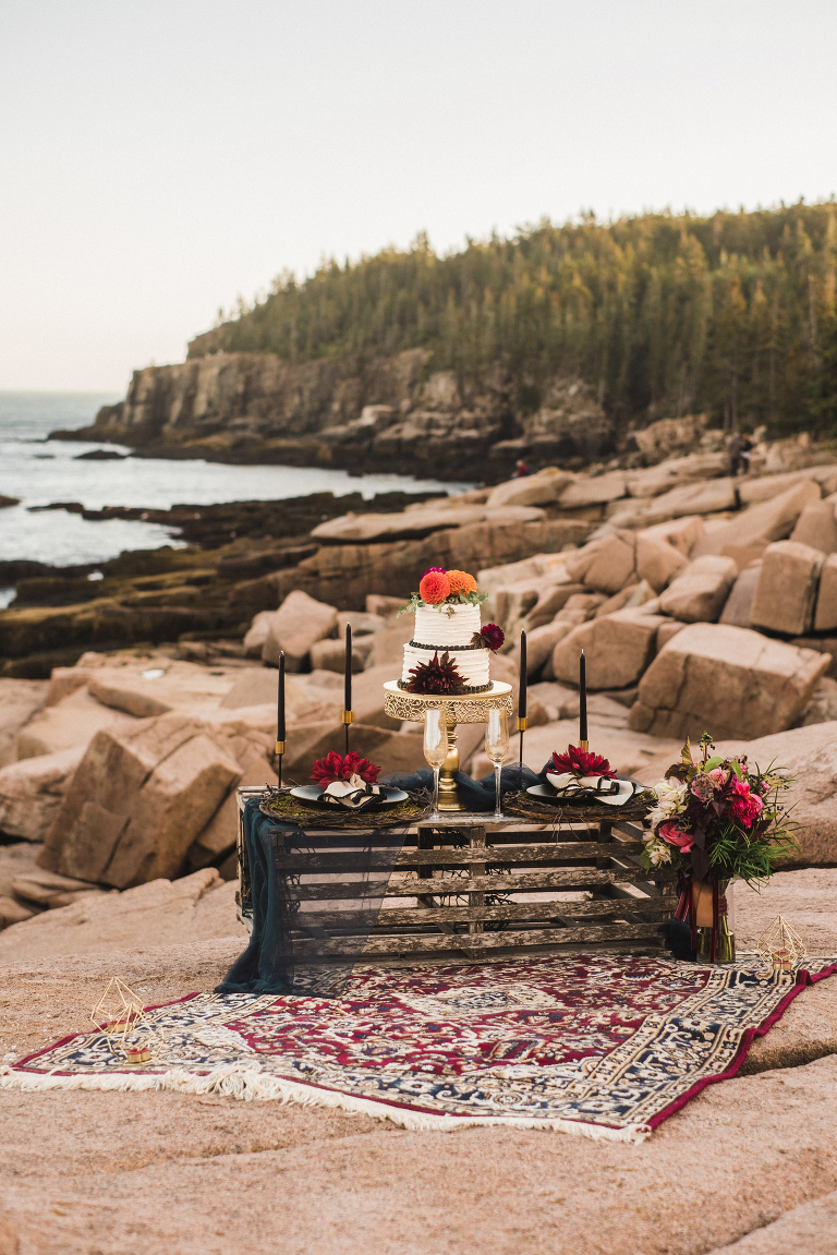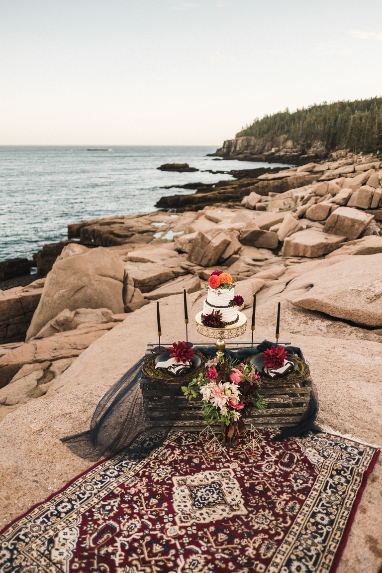 Our first stop for the Acadia photo shoot was Jordan’s Pond. Because we had to be at our second location in time for golden hour, we had to arrive at the pond earlier in the day when it was quite bright and sunny. The two mountains in the back are known as “the bubbles.” We ended up with the most incredible early autumn day. After Jordan’s Pond, we made our way to Boulder Beach overlooking Otter Cliff. From the cliffs we set up the loveliest table for two using an old lobster cage (borrowed from my Aunt Tammy’s porch) as the table. It was very fitting for a romantic waterfront setting in Maine. We placed an oriental rug underneath for comfort and style and Matthew and I decorated the settings with chiffon fabric, black candlesticks, black plates, and napkins with napkin rings that matched beautifully with Jacqueline’s cake design. It was the perfect place to celebrate and take in the beauty of Acadia.
