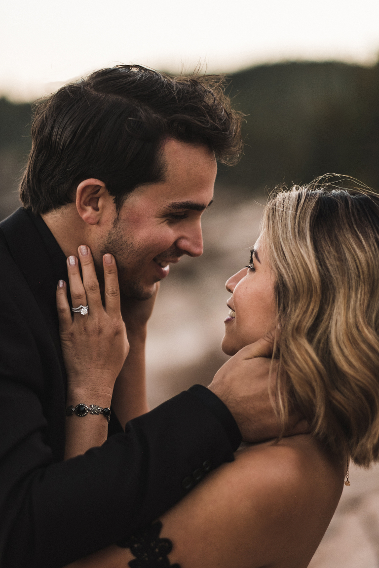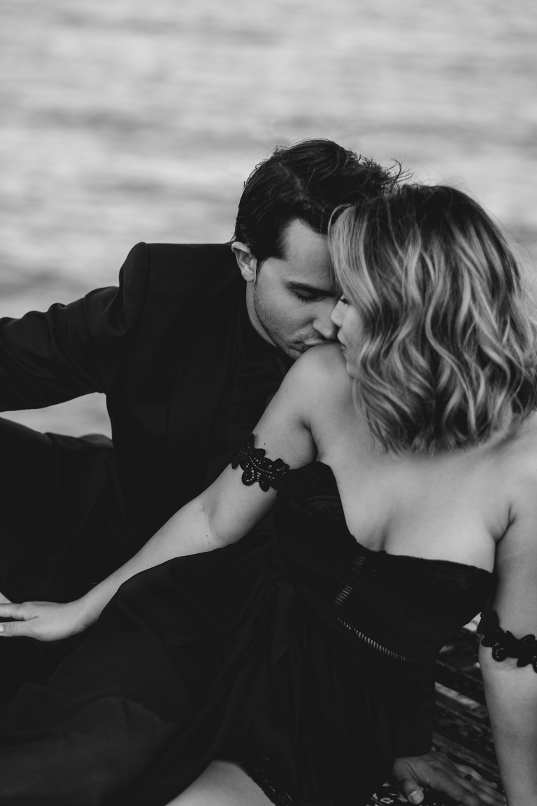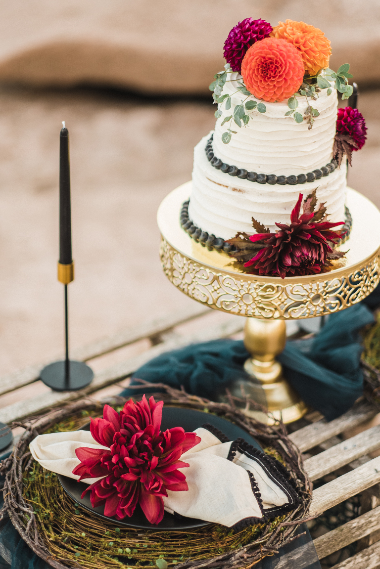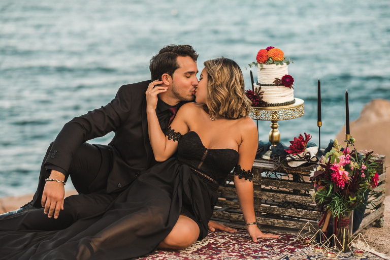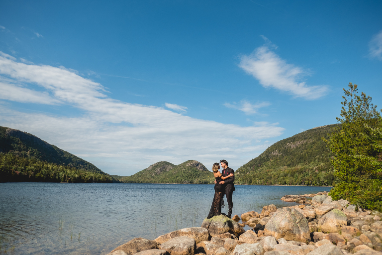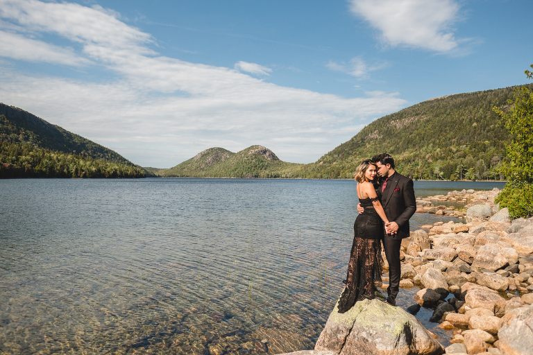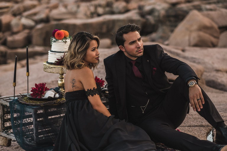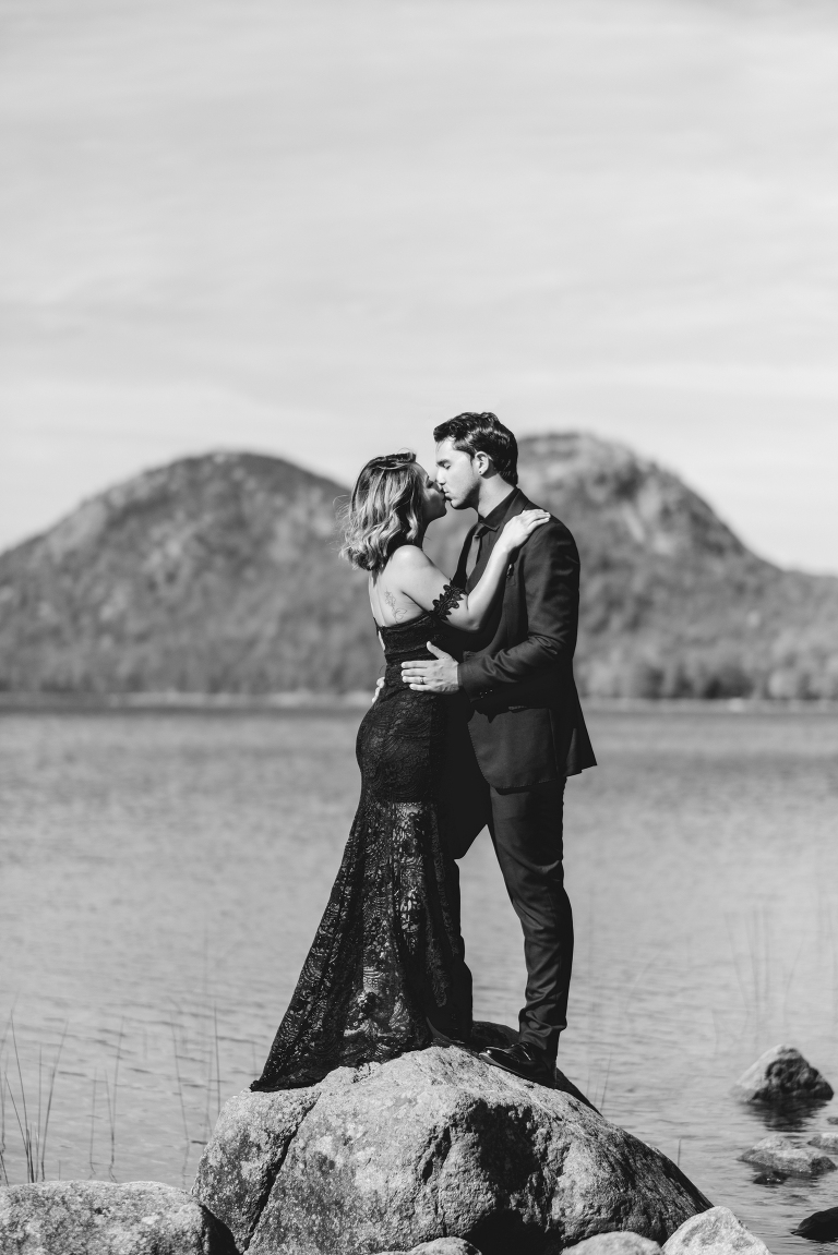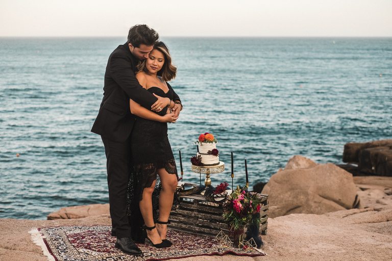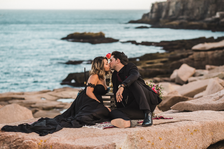 Our first stop for the Acadia photo shoot was Jordan’s Pond. Because we had to be at our second location in time for golden hour, we had to arrive at the pond earlier in the day when it was quite bright and sunny. The two mountains in the back are known as “the bubbles.” We ended up with the most incredible early autumn day. After Jordan’s Pond, we made our way to Boulder Beach overlooking Otter Cliff. From the cliffs we set up the loveliest table for two using an old lobster cage (borrowed from my Aunt Tammy’s porch) as the table. It was very fitting for a romantic waterfront setting in Maine. We placed an oriental rug underneath for comfort and style and Matthew and I decorated the settings with chiffon fabric, black candlesticks, black plates, and napkins with napkin rings that matched beautifully with Jacqueline’s cake design. It was the perfect place to celebrate and take in the beauty of Acadia.