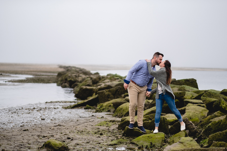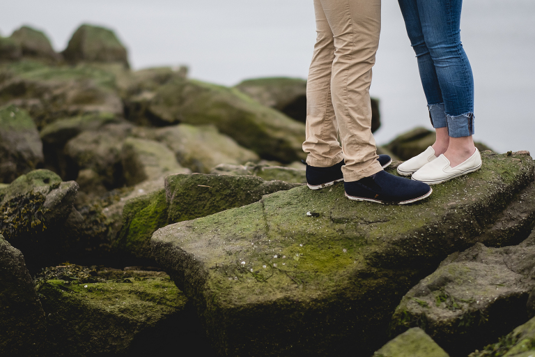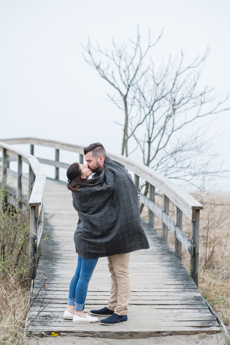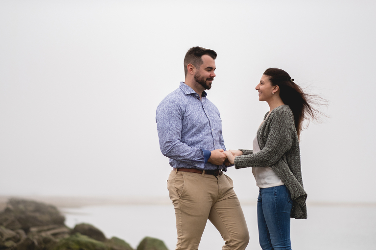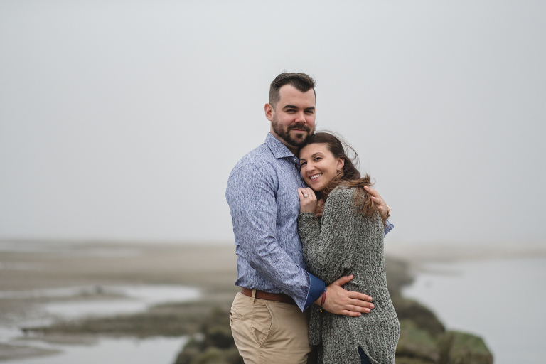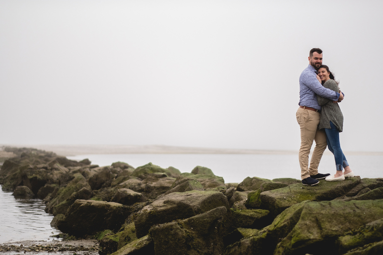 Alyssa and Nick braved a chilly and foggy day (that also turned into some rain) for their Milford beach engagement and I am so glad that they did! Although a sunny day with a blue sky was what we were going for, we ended top with something completely different and with the most magical results. The moss covered rocks, the fog over the shore, and the empty beach made for an engagement session that felt like it was in some far off place in a world made just for the two of them.
