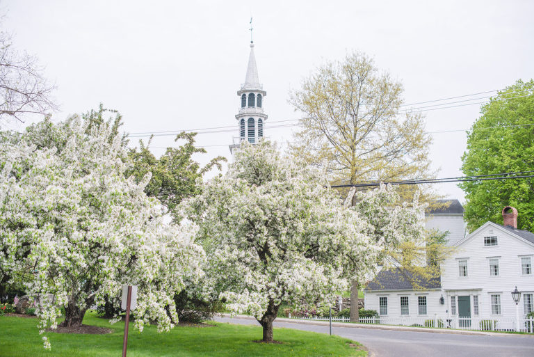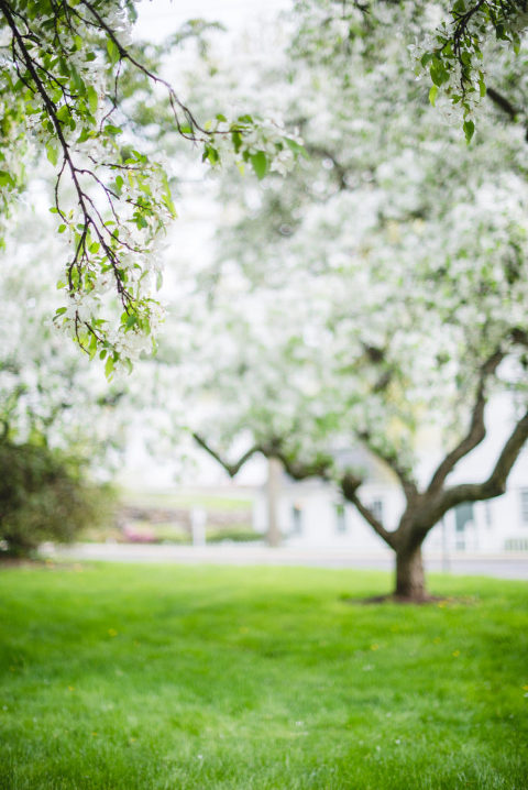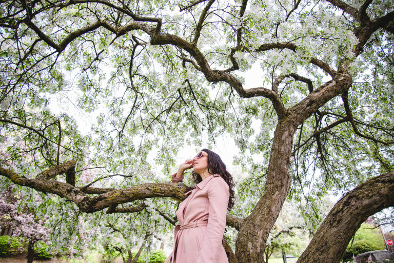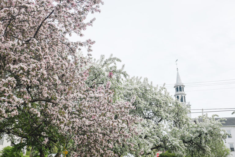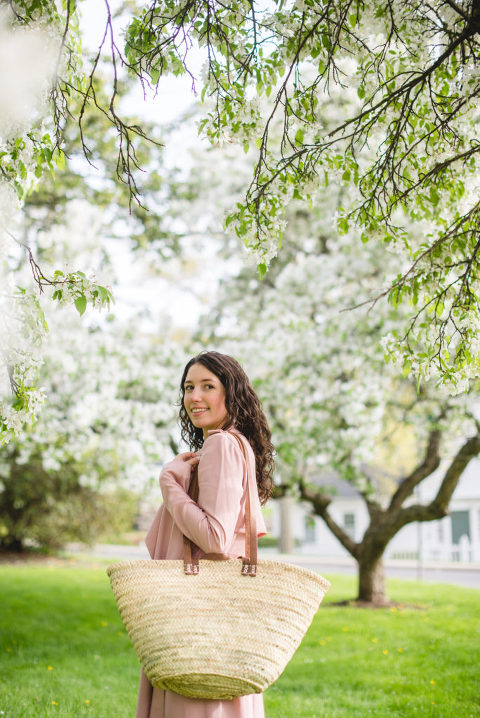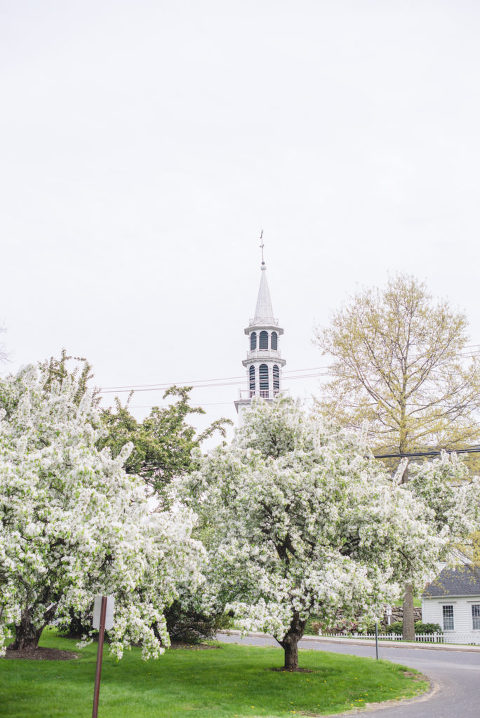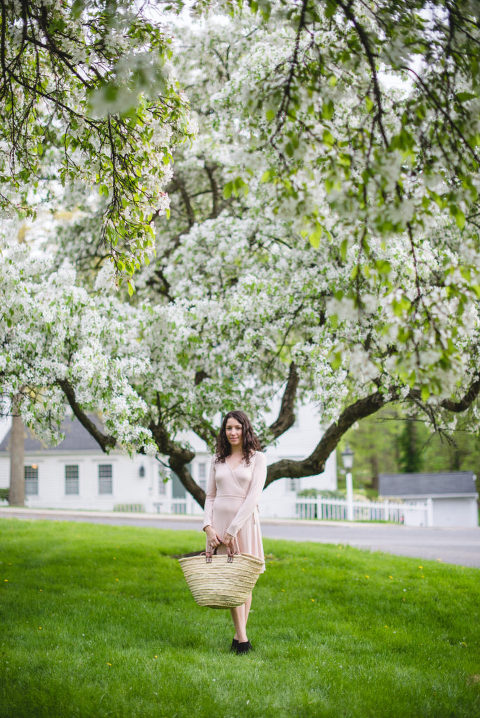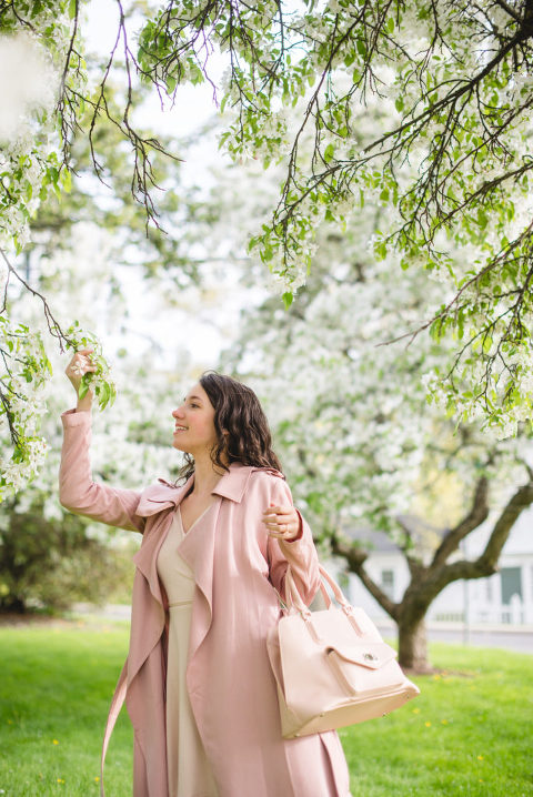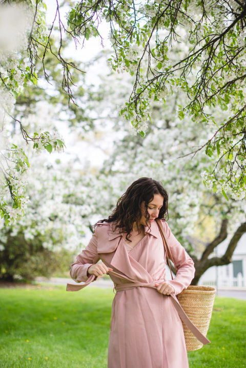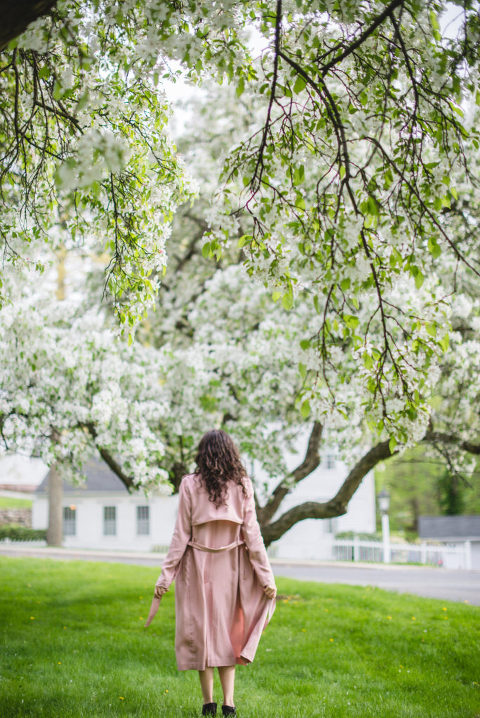 Right across the street from the Historic Downtown Woodbury post office you will see a collection of beautiful flowering crab apple trees. The little park takes up a small area between the town hall and the post office. It hosts a little memorial for woodbury soldiers, numerous benches, and a collection of the most beautiful flowering trees. Above the treetops towers the tall steeple of an old white 1700s church and another old church stands sturdy at the other end of the street. I pass by the flowers every morning on my way to pick up the mail for work and knew that I had to come back to spend more time before the petals begin to fall. As it was a chilly day, I wore my new trench coat (Belle Badgley Mischka Women’s Angelina Trench Coat,), and grabbed my basket and my Fuji X100 T.