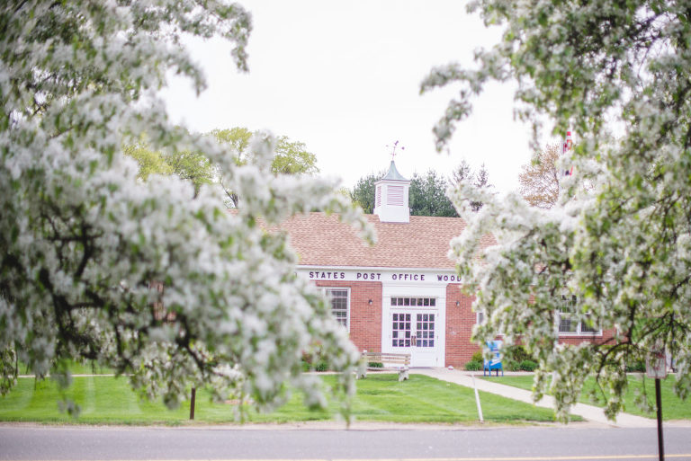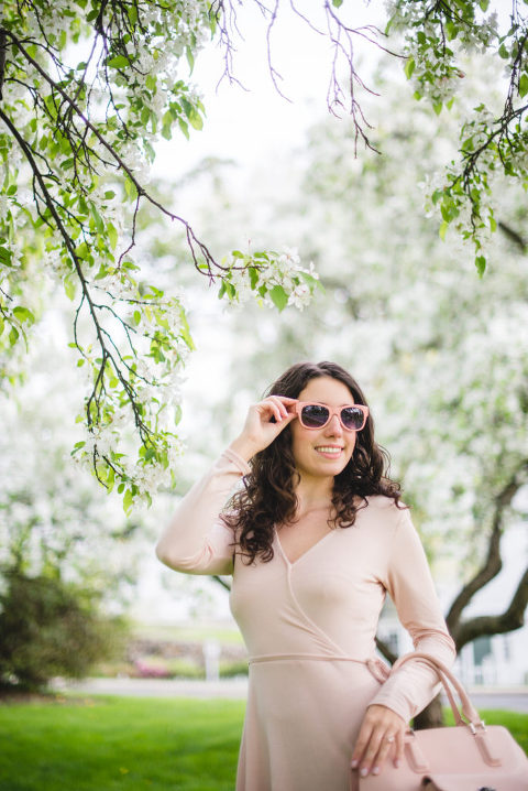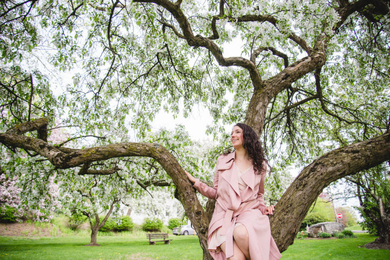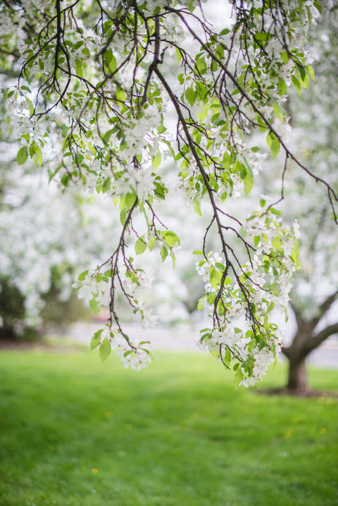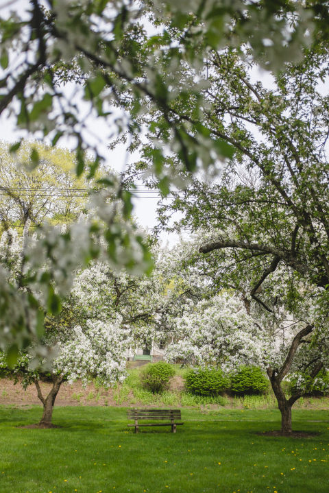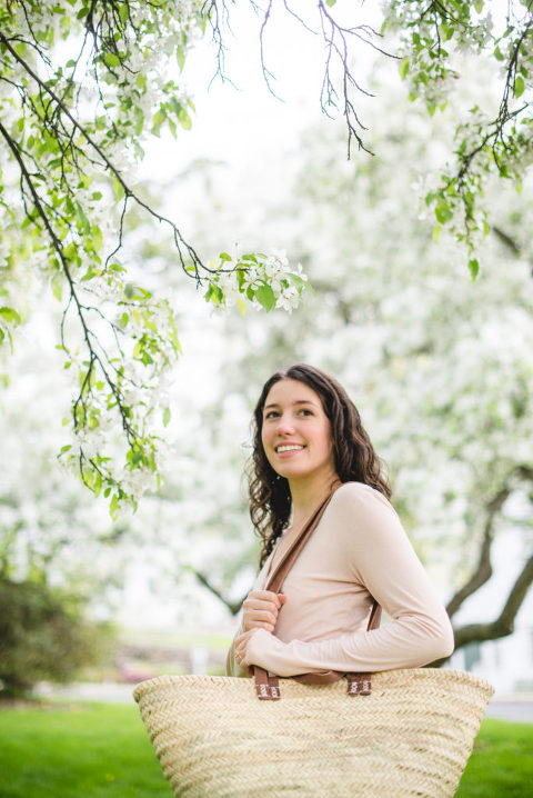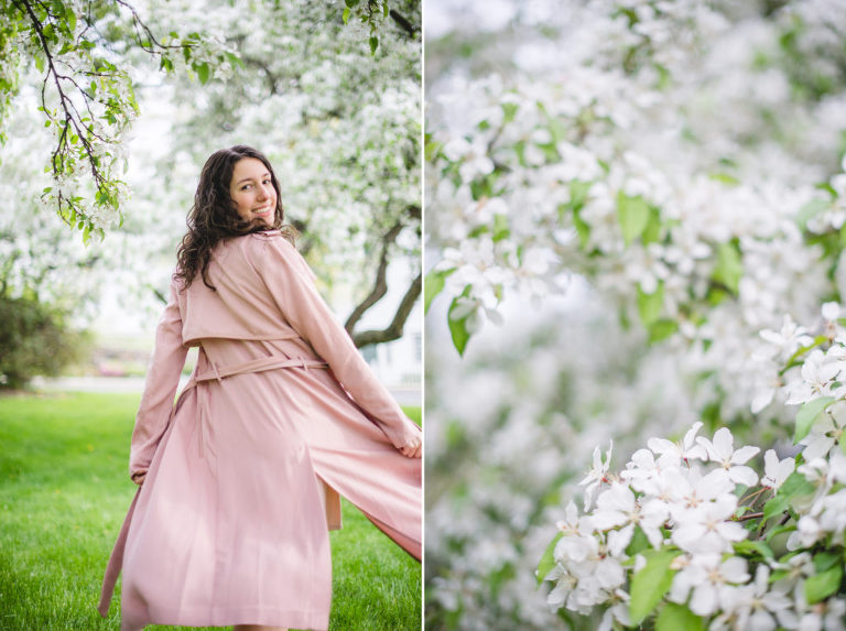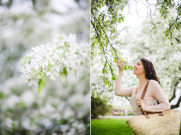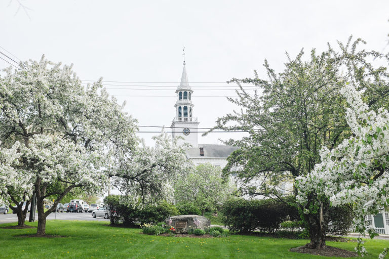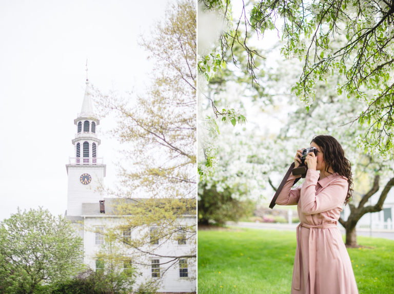 Right across the street from the Historic Downtown Woodbury post office you will see a collection of beautiful flowering crab apple trees. The little park takes up a small area between the town hall and the post office. It hosts a little memorial for woodbury soldiers, numerous benches, and a collection of the most beautiful flowering trees. Above the treetops towers the tall steeple of an old white 1700s church and another old church stands sturdy at the other end of the street. I pass by the flowers every morning on my way to pick up the mail for work and knew that I had to come back to spend more time before the petals begin to fall. As it was a chilly day, I wore my new trench coat (Belle Badgley Mischka Women’s Angelina Trench Coat,), and grabbed my basket and my Fuji X100 T.