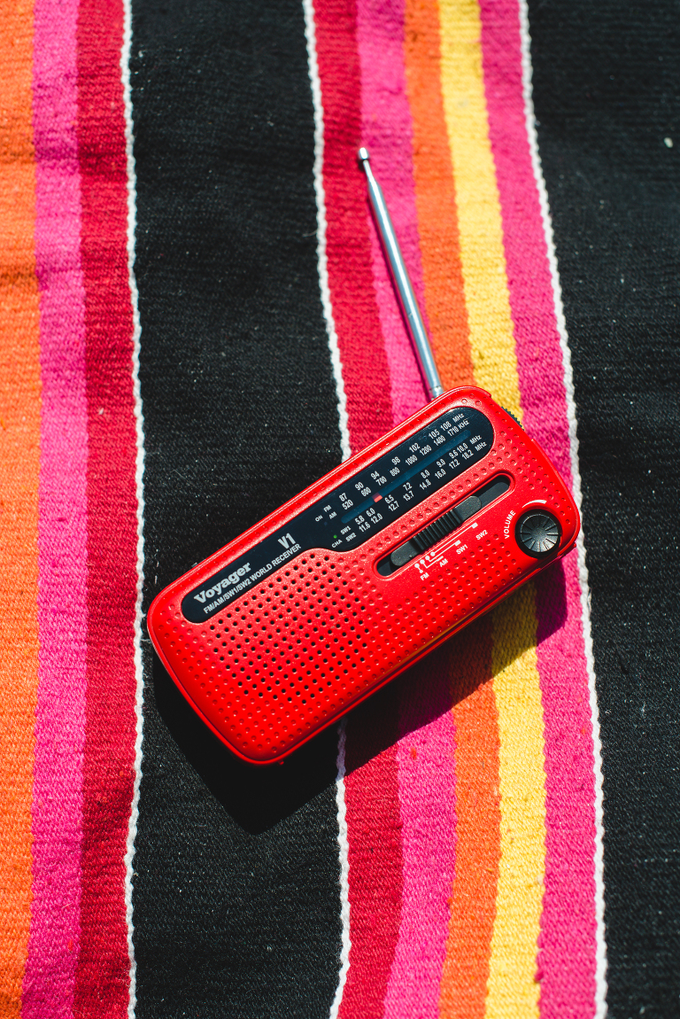 • A portable solar powered radio with a built-in flashlight and cell phone charger
