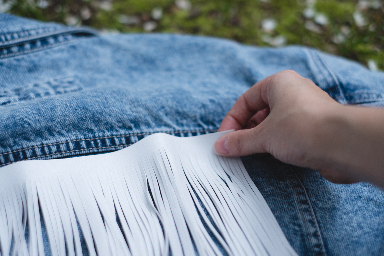 A note about the fringe: The fringe I found on Amazon here. I had to buy two packs as one was just a little too short to make it across the entire back of the jacket. I wanted my fringe to be white, but you can go with whichever color you desire. I preferred my fringe to be 6″ in length. Anything shorter was not flowy enough for the look I was going for and everything longer was just too much for me. I felt like anything longer would get in the way. It took me a while to find the perfect fringe as I could not find what I was looking for anywhere until I finally found this one. The reviews for it were really bad so I was nervous about the purchase. Yes, it does have a strong odor like the reviews said, but honestly, it wasn’t as terrible as I imagined and it aired out after a week and was fine. If you purchase this fringe, take it out of the package and let it air out by a window for a little while and it won’t be a problem.