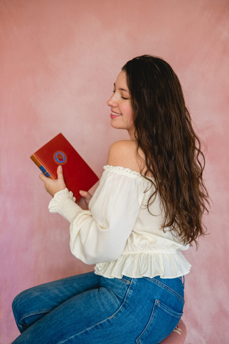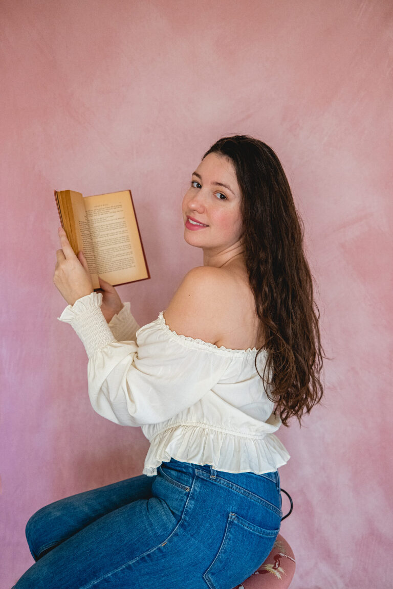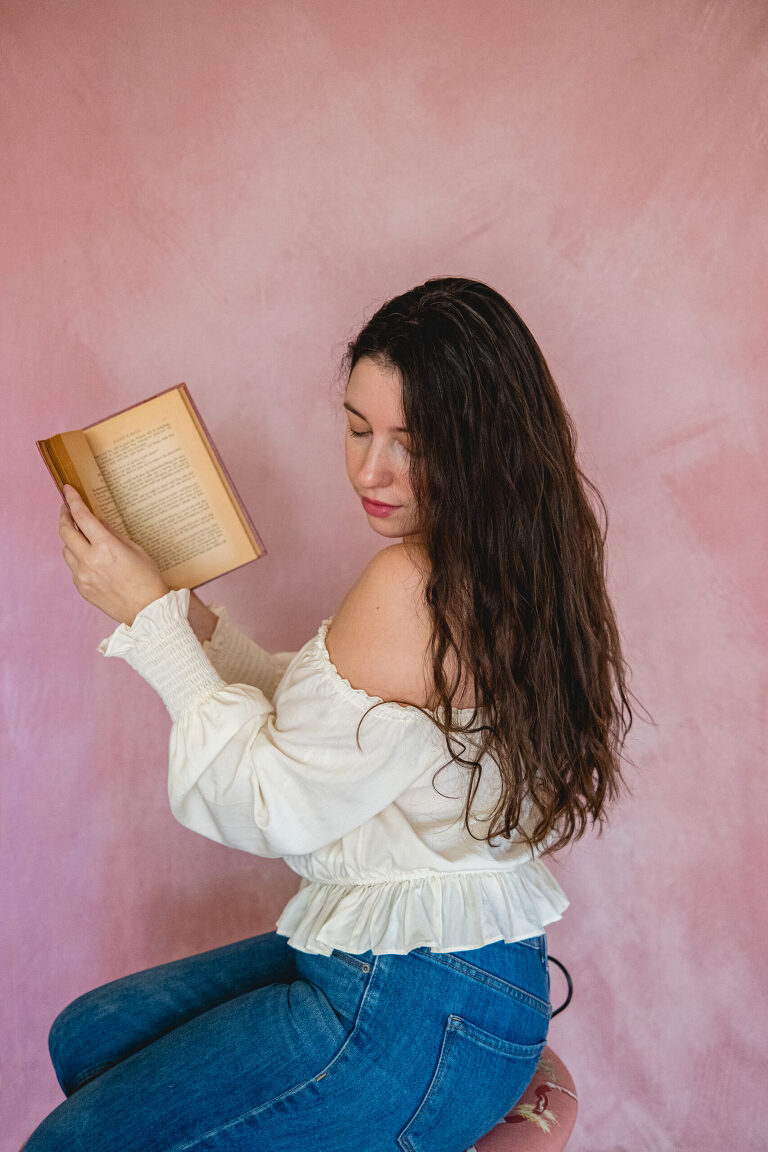 So yesterday morning I set up a little backdrop in my living room when there was still some good window light. Even though I was exhausted and my hair was a mess, I started to take some photos. I used the book I am currently reading, Little Men by Louisa May Alcott, as a prop. I took out a flower from the kitchen vase and the vanity chair from our guest room. Instead of setting up my pro camera and going between lenses, I set up my Fujifilm X100 V with its single attached lens. I laughed at myself and snapped away.