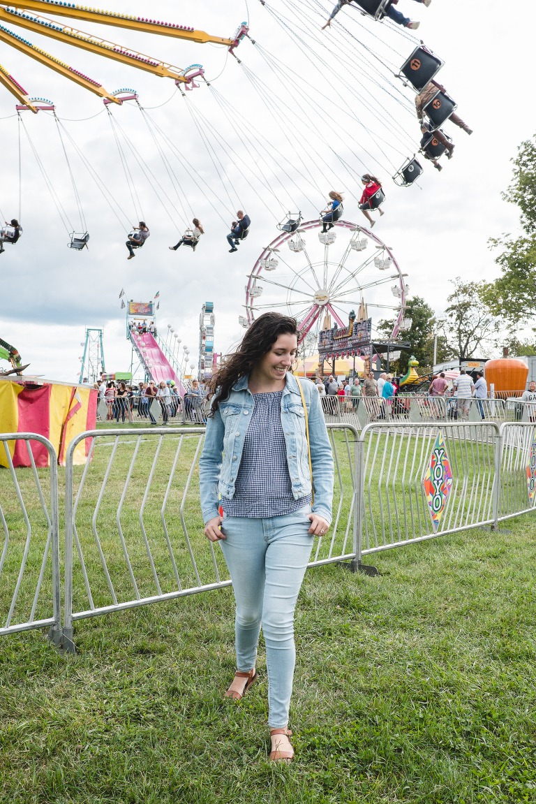When going to a country fair it is always best to dress in something comfy. Gingham or patchwork patterns work best and this time of year I never leave home without a jacket just in case it starts to cool down again. On rainy days I wear cowgirl boots, but on this sunny day I wanted to pretend it was still summer one last time. Some fairs are too dusty or muddy for sandals. The best pants of choice are definitely blue jeans.