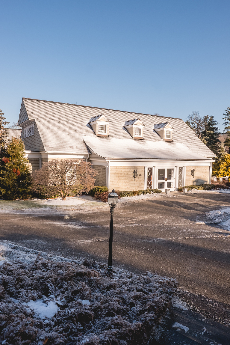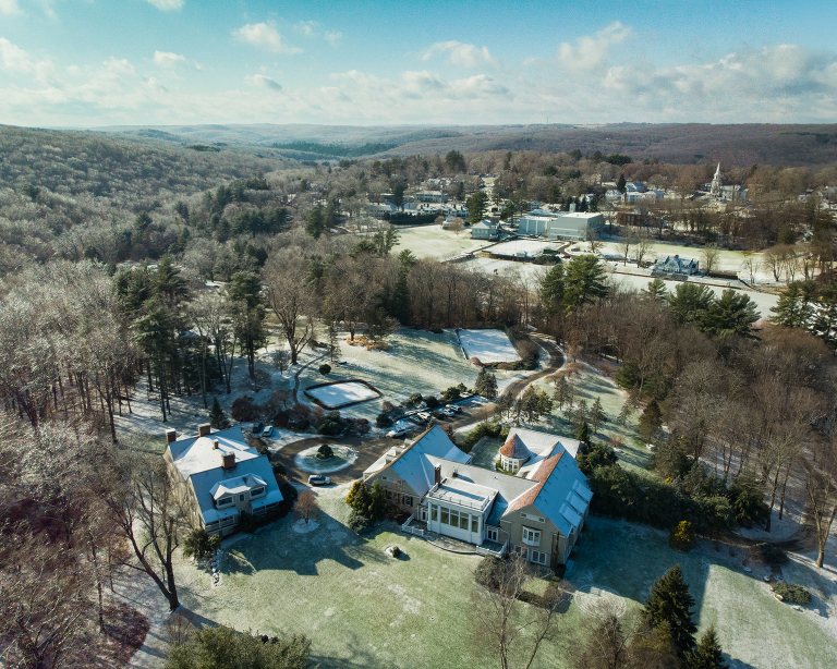 While I enjoyed my brisk morning walk, Matthew took his drone to the skies to take a look at Washington and the Mayflower Inn from above. The trees were coated in ice from the freezing rain the day before, but with the beautiful winter sunlight it lit up into a whimsical winter wonderland. Our suite was located in the building pictured below to the left and the spa is the large building to the right. The rest of the Mayflower is obscured by the trees in this picture, but you can see the town and the tall white steeple of the church to the right.