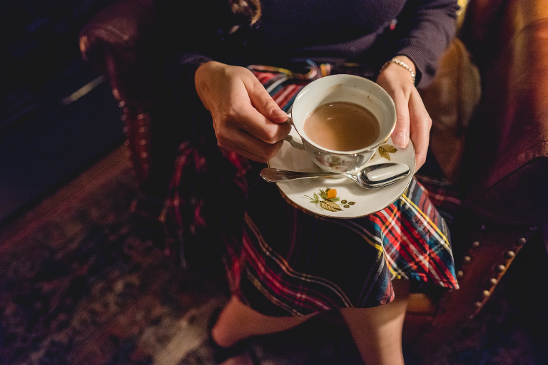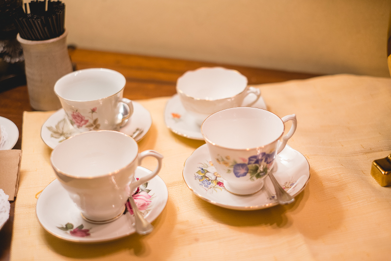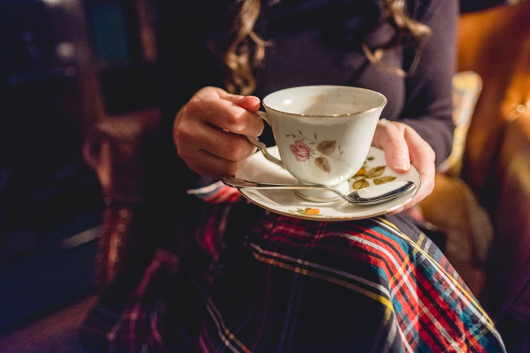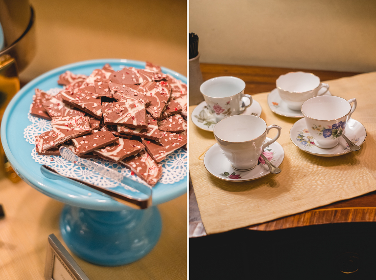 Cocoa in teacups with peppermint bark chocolate? Yes please.