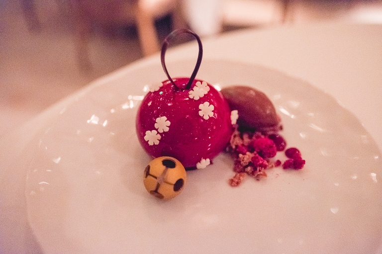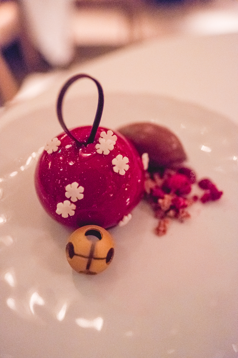 I ordered the pomegranate cheesecake, which was heaven in a bite, and Matthew order the apple dessert. Our server surprised us with this holiday preview dessert right from their Christmas menu! Inside the creamy red confection is chocolate moose with a raspberry cream center served with chocolate gelato, snowflake sprinkles, a chocolate bell, and a side of dried raspberry crumbles. It was almost too pretty to eat!