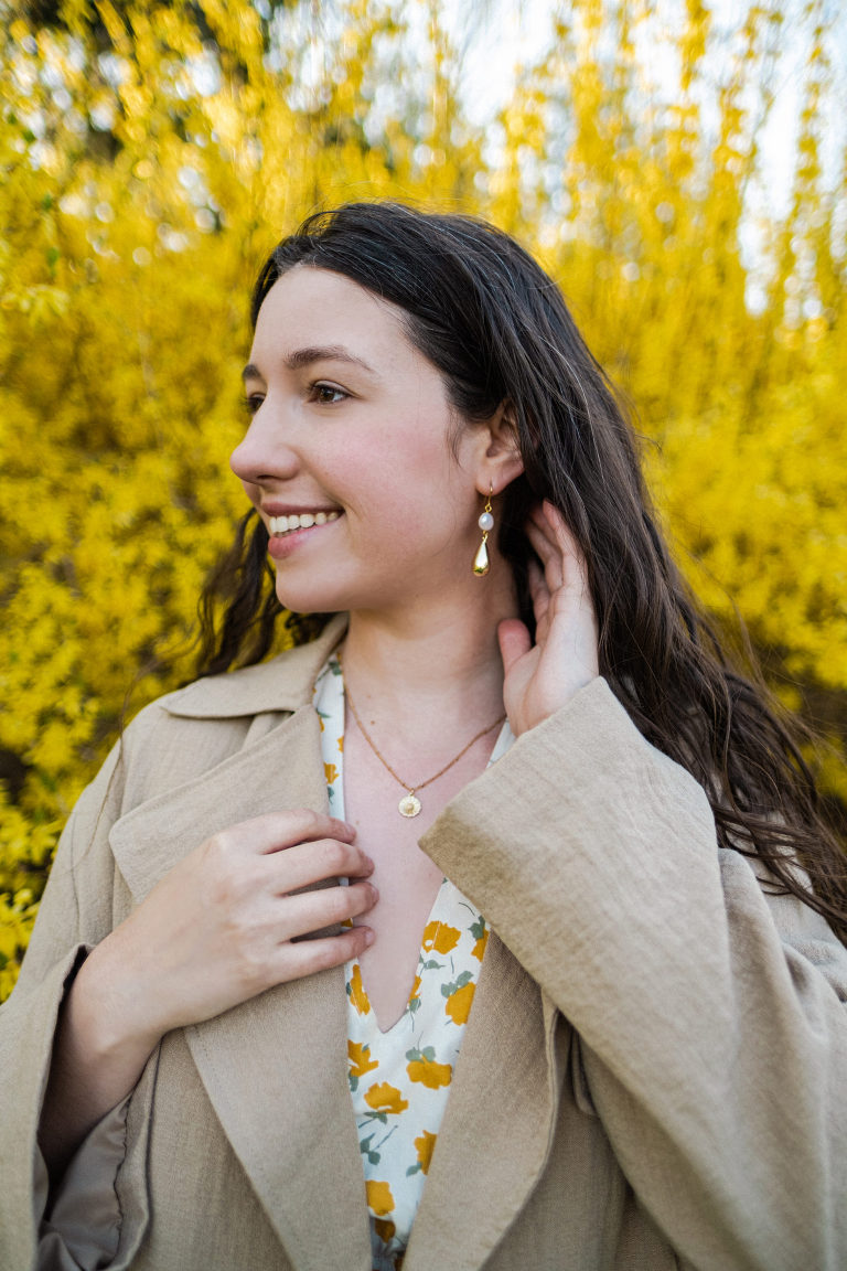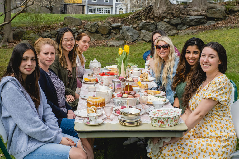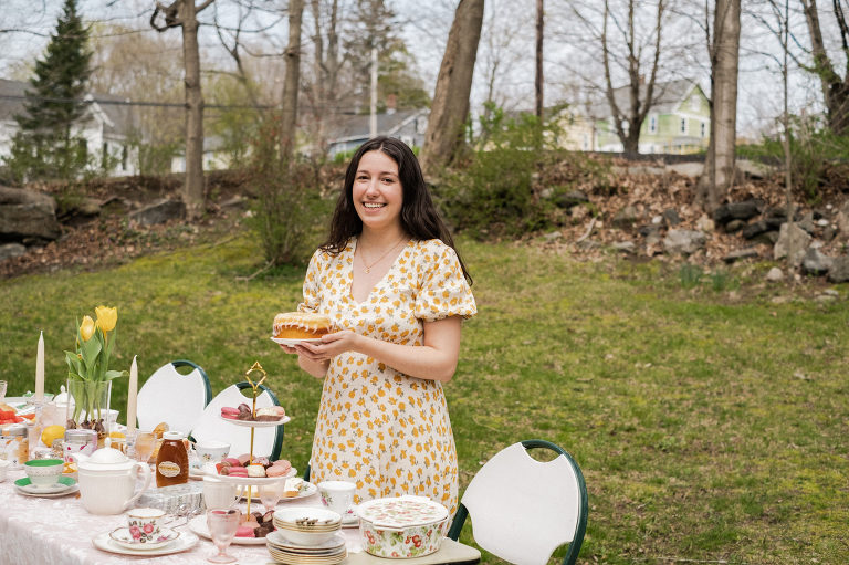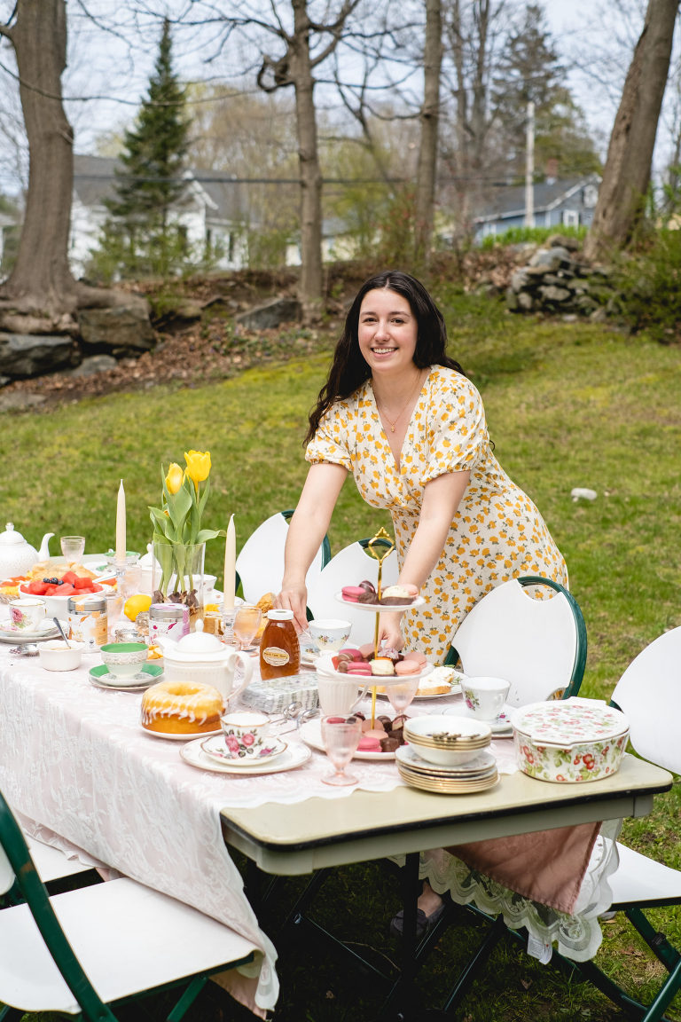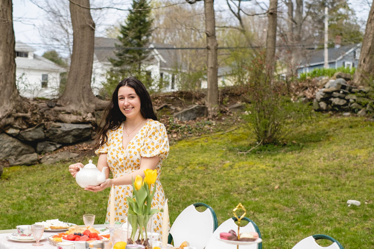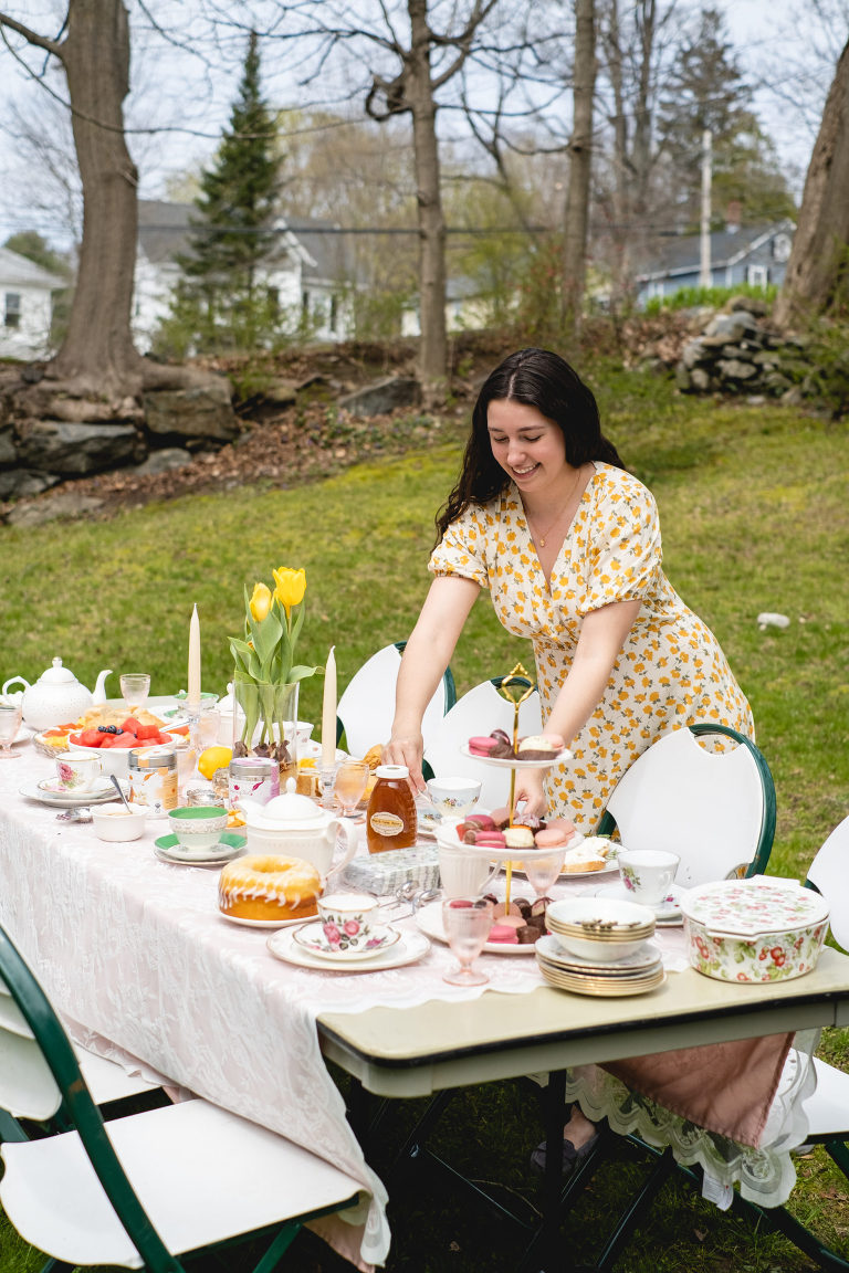 Tea parties do not have to be fancy affairs, but it is customary for guests to dress up a little bit. A tea length midi dress is perfectly acceptable. This lovely spring floral dress with puffed sleeves and a subtle high low hem is from our local Hope & Honey Boutique in Litchfield. I paired the dress with beautiful earrings and a gold daisy necklace from Hope & Honey.