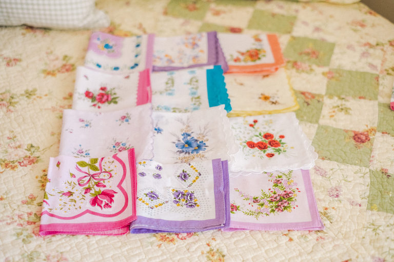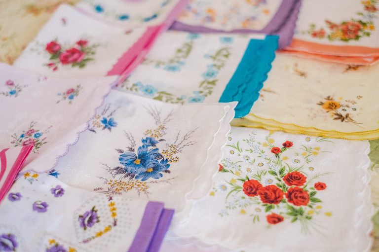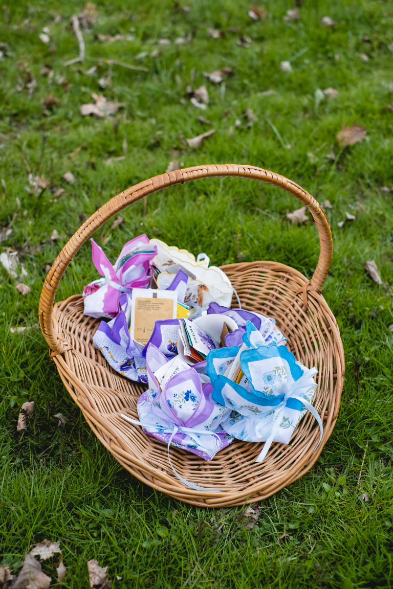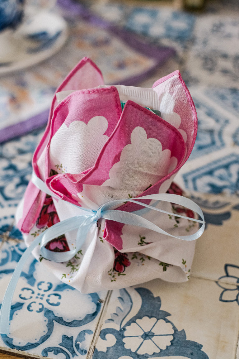Each cup was then individually wrapped with a handkerchief to match and tied with a ribbon to keep it all together into a dainty parcel.