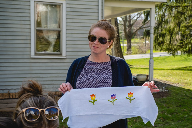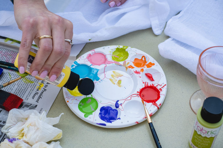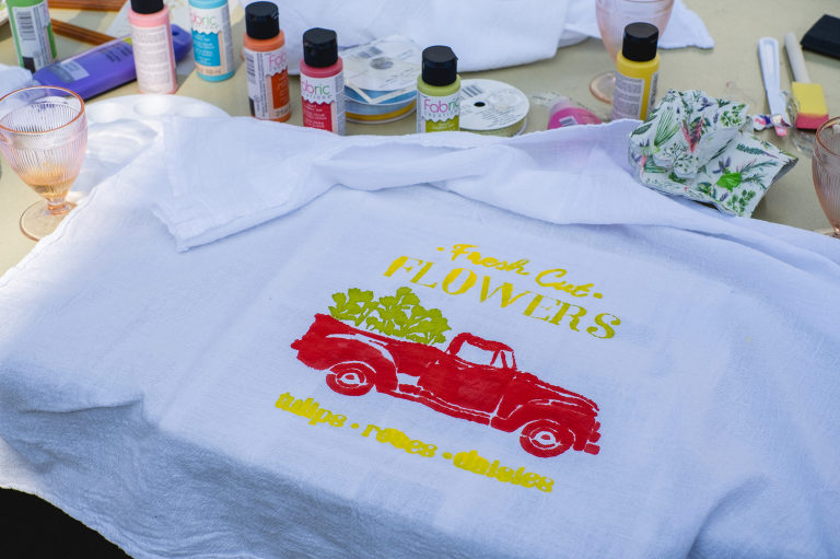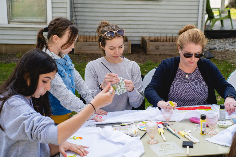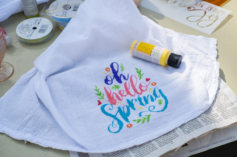 Popular party activities may include games like board games, cards, or even yard and garden games like croquet or badminton. You can do a craft like beading jewelry, simple embroidery patterns, or painting. For the spring tea party I decided on painting spring themed tea towels.
