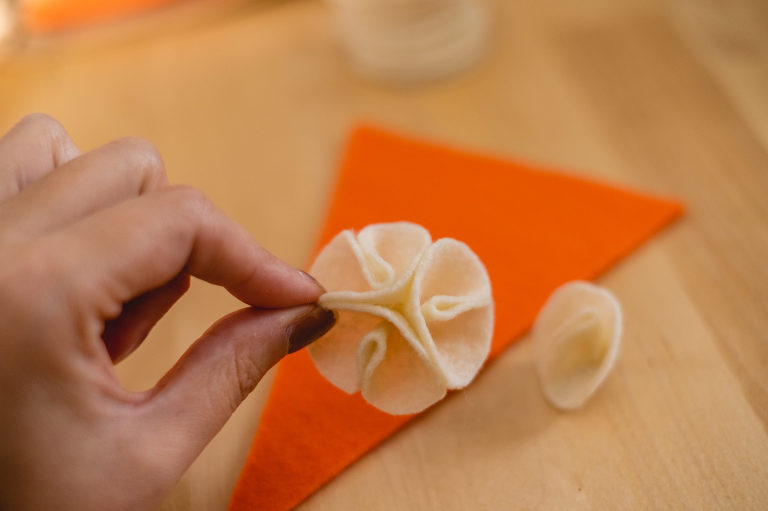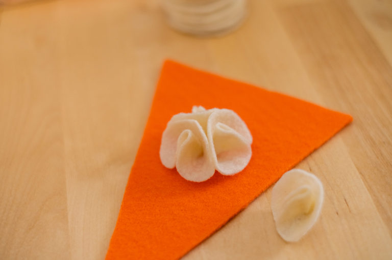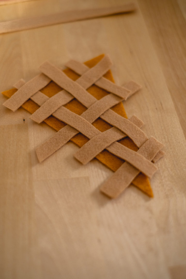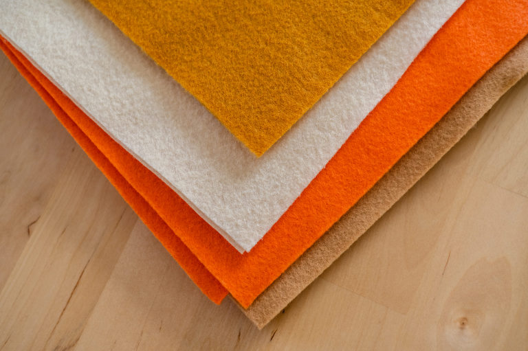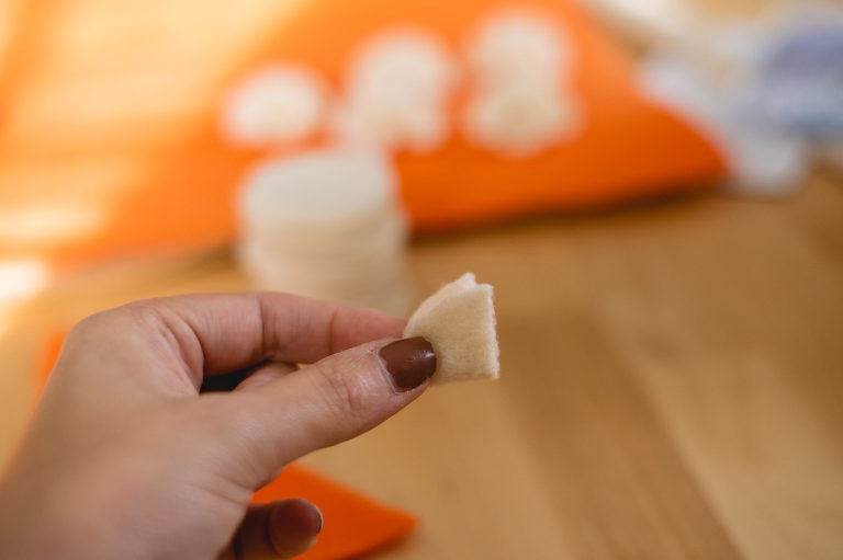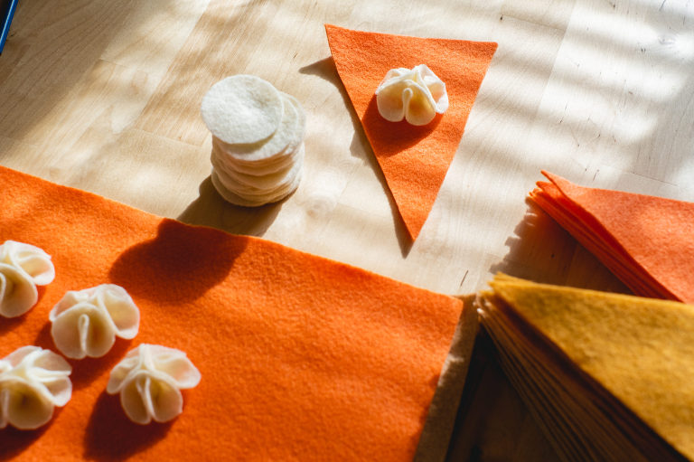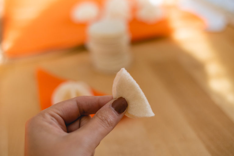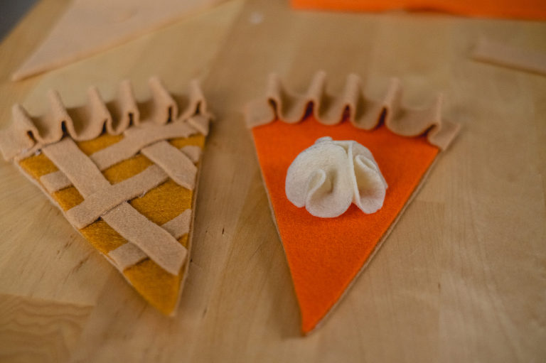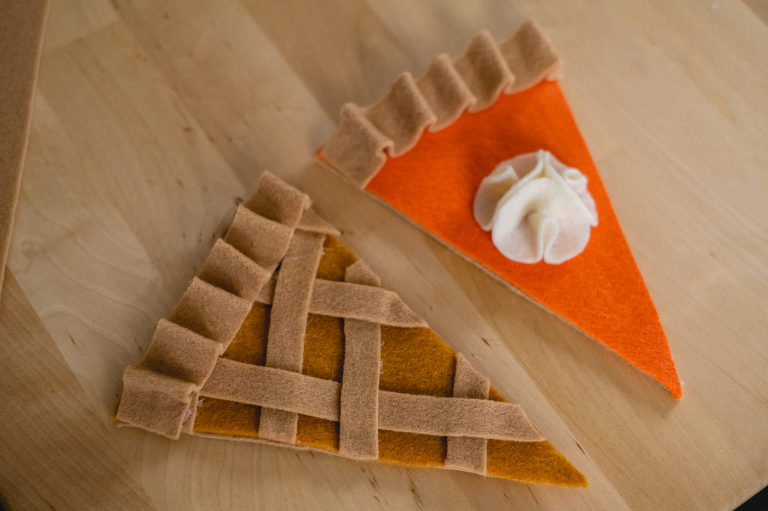 For Thanksgiving, I decided to go with the two classics; pumpkin pie and apple pie. I’m always torn between which one so I usually do a slice of both. There are many types of pies that could be your favorite, so you do not have to stick with my chosen flavors, but for aesthetics the two work very well for autumnal colors. You can easily substitute the orange felt for the pumpkin pie to a lime green to make a key lime pie instead. Or instead of the caramel colored felt for the apple pie, you can exchange it for blue, purple, red, or pink to make a berry, cherry, or even a rhubarb pie. There are also numerous other pie styles you can make using your own imagination. Love pecan pie? Make little pecans out of brown felt. Love a pie with a curst top with heart shapes? Make a unique top instead. Use your imagination. For the purposes of this tutorial, I am going to show you how I made my own pumpkin and apple pie slices out of felt.