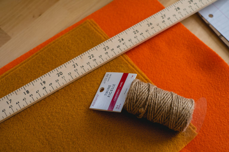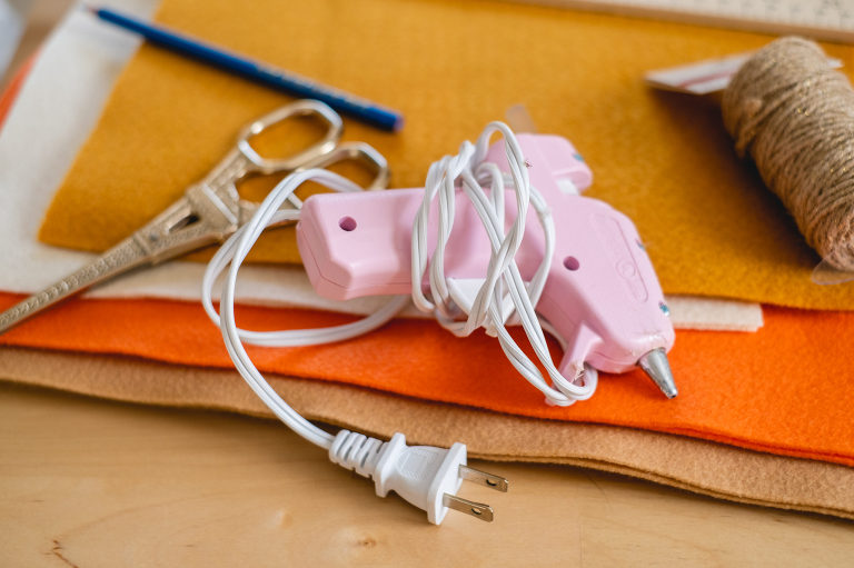 Now it is time to string them all together. Line your slices so that they alternate between the two flavors. Use your hot glue gun to glue twine between the two pieces of felt to secure them to the garland, leaving about two-three feet of twine at the edges so that you can hang it.