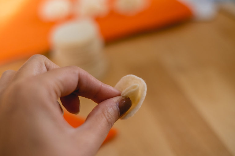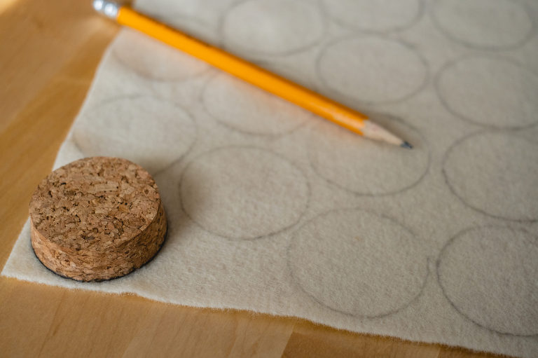 Now that we have our pie crust base and our pie slices, you will need to find something round to trace (approximately 1.5″ in diameter). I used a cork candle lid. the base of a champagne glass, a candle, or a small jar could also work. You will need three circles to make a single whipped cream topping. For one garland with six pumpkin pie slices you will need 18 circles. Double it if you are making two garlands.