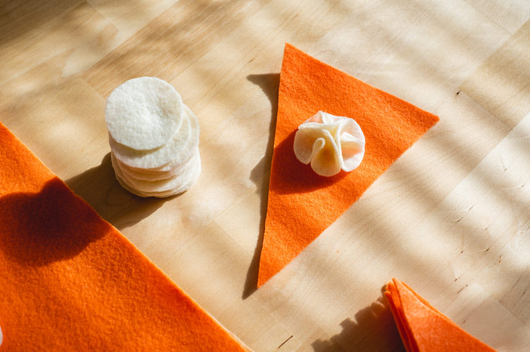 Next you will do the same for your pie slices. For one garland you will need six orange slices for the pumpkin pies and six caramel colored slices for the apple pies (or any color for whichever pie you are making). For two garlands you will double this amount.