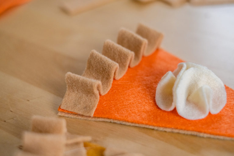 To finish the slices, glue a centimeter and a half wide strip of felt at the top of the pie, making waves with the fabric to emulate a pie crust like this: