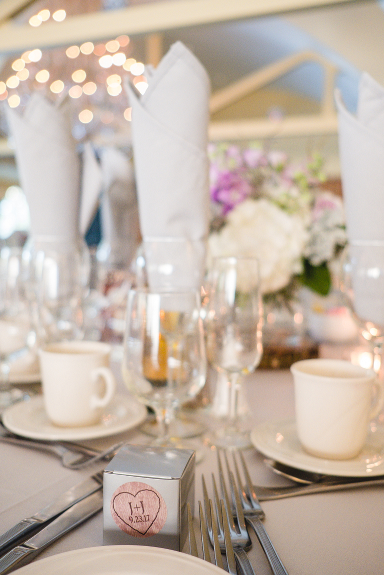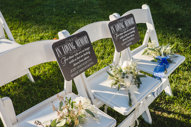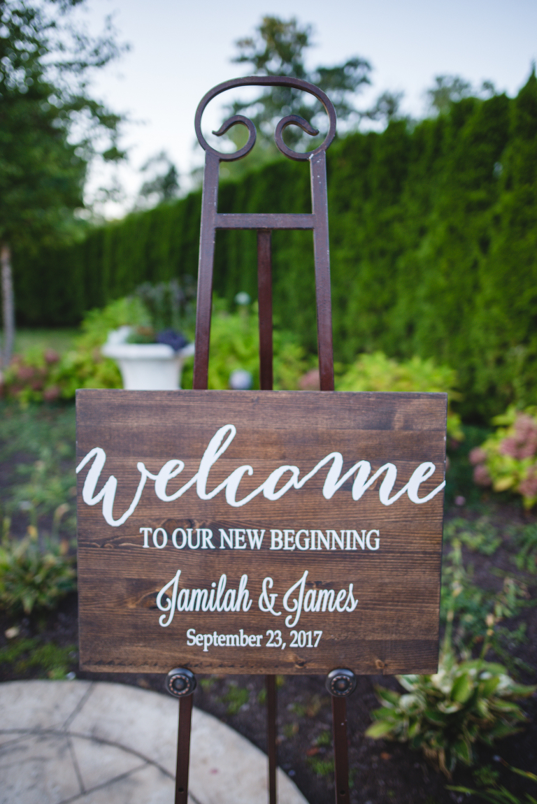 The ceremony began right outside the venue overlooking the lake as the sun began to set in the early Autumn sky. Guests walked by this lovely sign on their way to their seats.