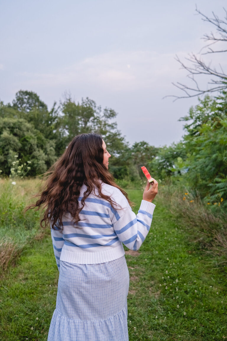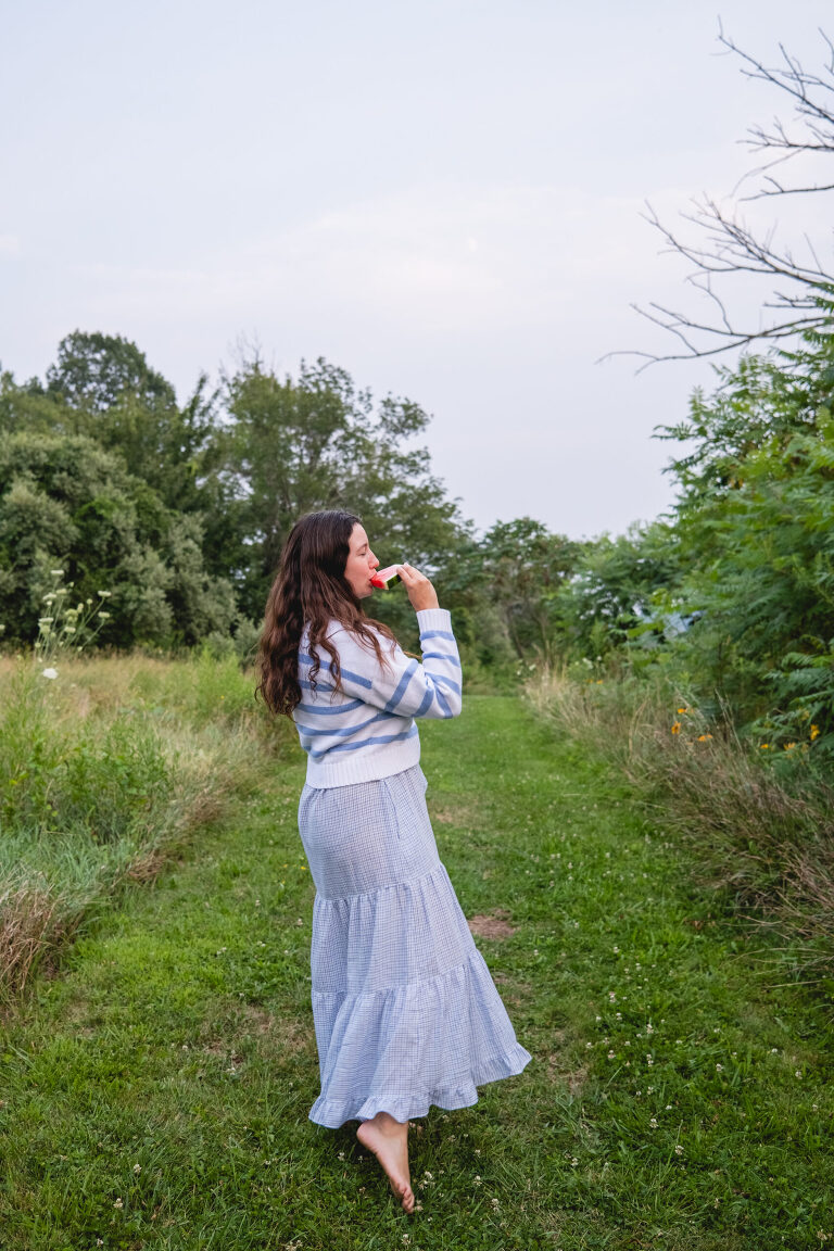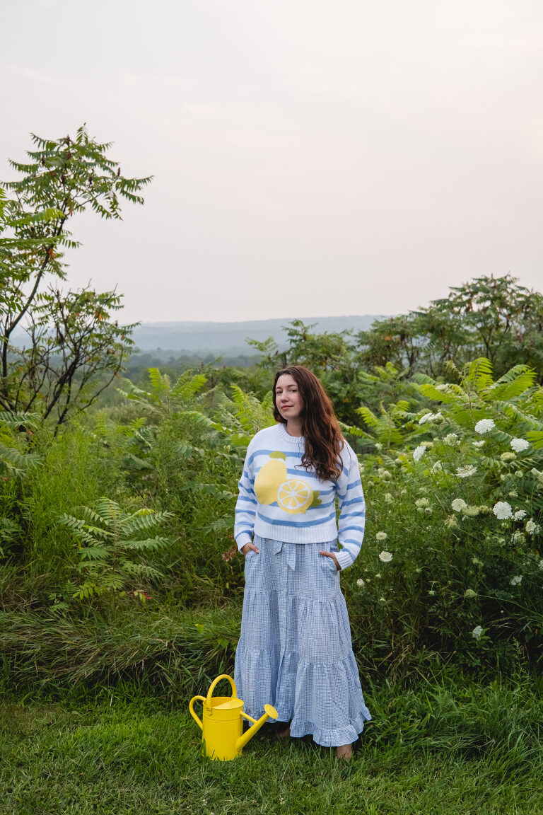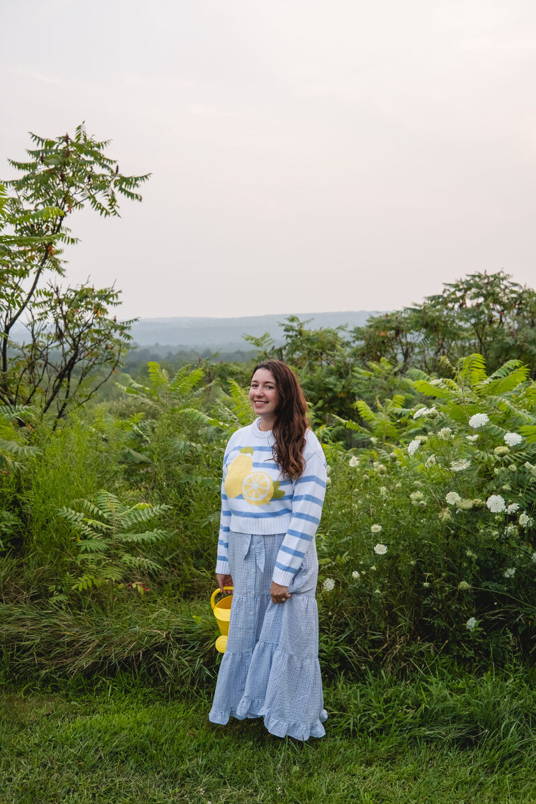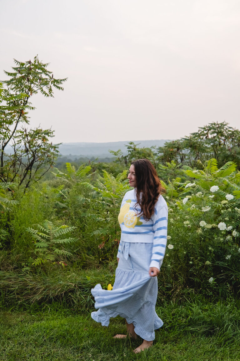 The sweater would probably look better paired with some denim jeans or shorts. It is a little frumpy layered over the tie on this dress, but I love the way it feels and looking down at the stipes and lemons brings me joy. There is something about the swish of a long dress and walking barefoot in the grass and the coziness of a knit in the chill of a summer evening.