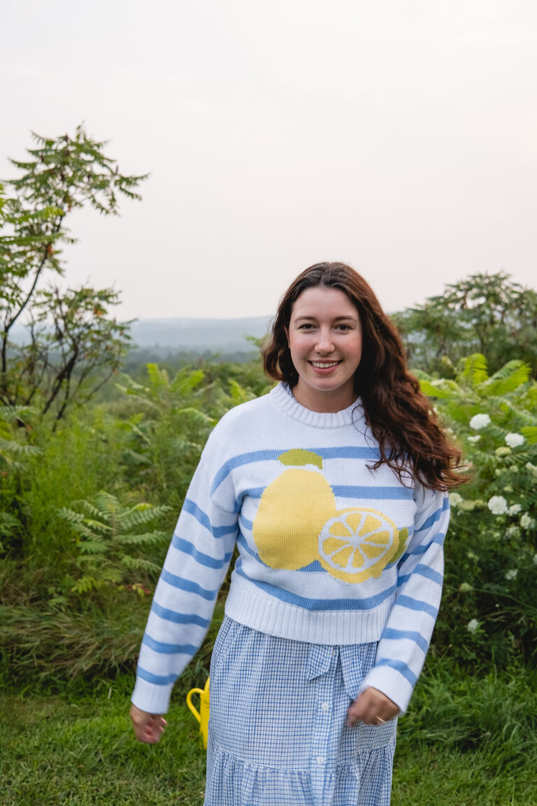 This is one of the outfits I have had on repeat all summer. I bought this blue and white checker maxi dress from TJ Maxx earlier this season as well as this striped sweater with the giant lemon print on the front. It is not secret that I love anything with a lemon print. If it has florals, stripes, gingham, polka dots, lemons, strawberries, tomatoes or a veggie print, I am going to love it.