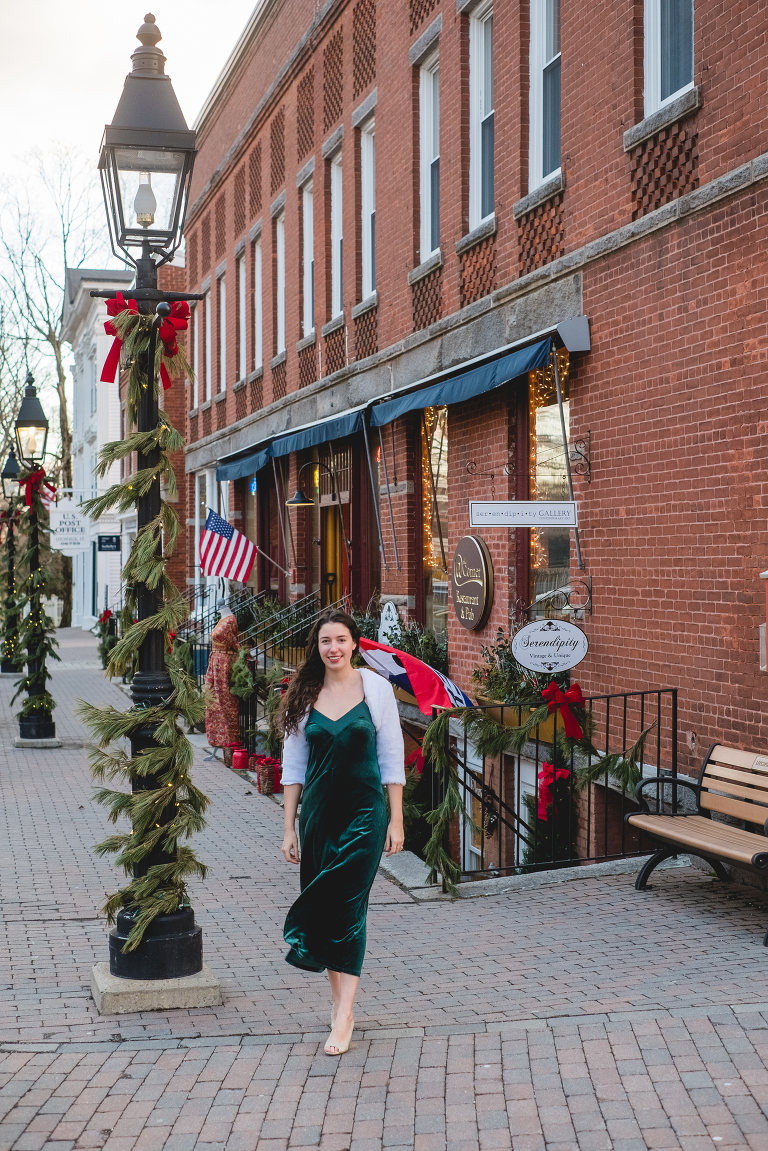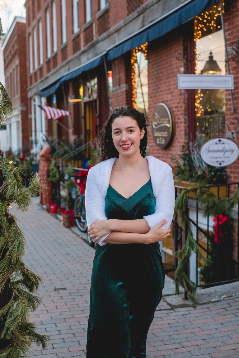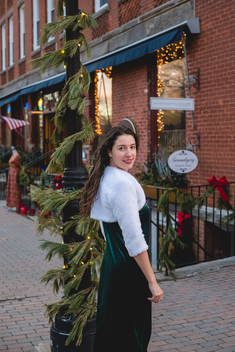 To modernize this look I took out my Christmas dress from last year; a slightly shorter green velvet dress that I bought at Target. And this faux-fur bolero found on Amazon is a more modernized version of Barbara’s with a little less poof to it. I love this cozy and elegant look for a formal Christmas dinner or an evening at a holiday show like The Nutcracker. It is my favorite of the classic holiday looks.