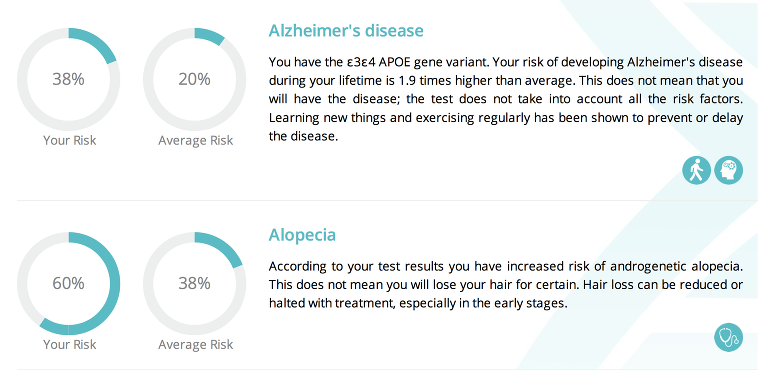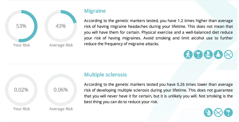 The test tells you what your likelihood of developing major diseases are and compares it to the average human’s risk in an easy to read format. Genetically, I was close to the average for just about everything, even below the average for many risks including heart related illnesses. .png)