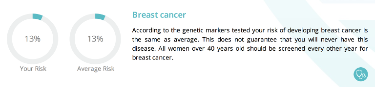 My risk for breast cancer was matched with the average and my risk for heart disease was thankfully well below average. I know that this is most women’s main reason for taking this test.