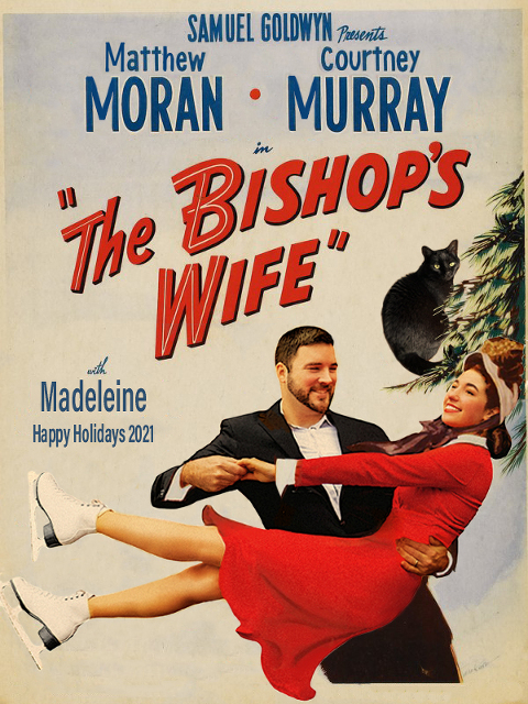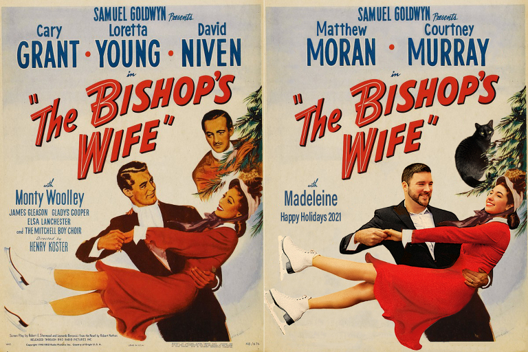I’m very happy to reveal our 2021 holiday card! I like to wait until Christmas Eve every year because I want my family and friends to see the card in their mailbox first. This year we recreated the Bishops Wife starring Matthew as Cary Grant, me as Loretta Young, and our cat Madeleine as David Niven. It is always funny when Madeleine gets to make an appearance. I did have to bribe her with treats to pose for this photo.