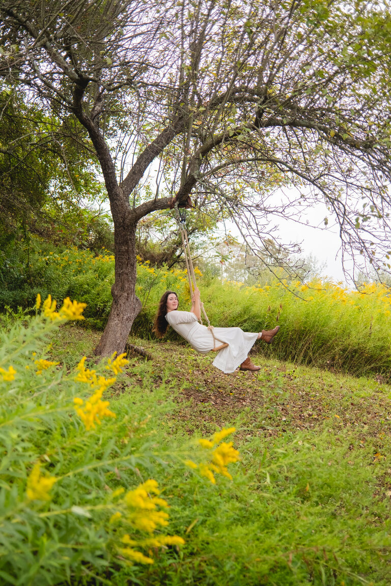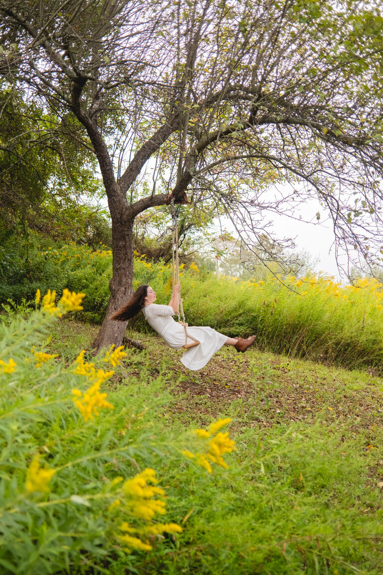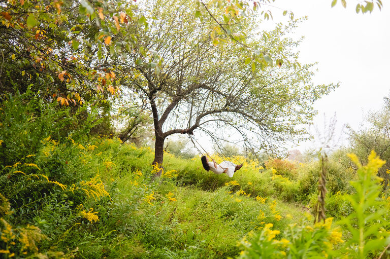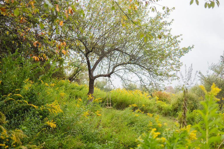 Past the greenhouse meadow trail there is an overlook with a view of our neighbor’s farm. In the brush there is a hidden trail going downhill and trailing behind the barn. Around that trail past a large rock and through tall stems of goldenrod, there is a clearing underneath an old red apple tree where Matthew has hung a wooden swing. I have nicknamed this hidden space our own secret garden.