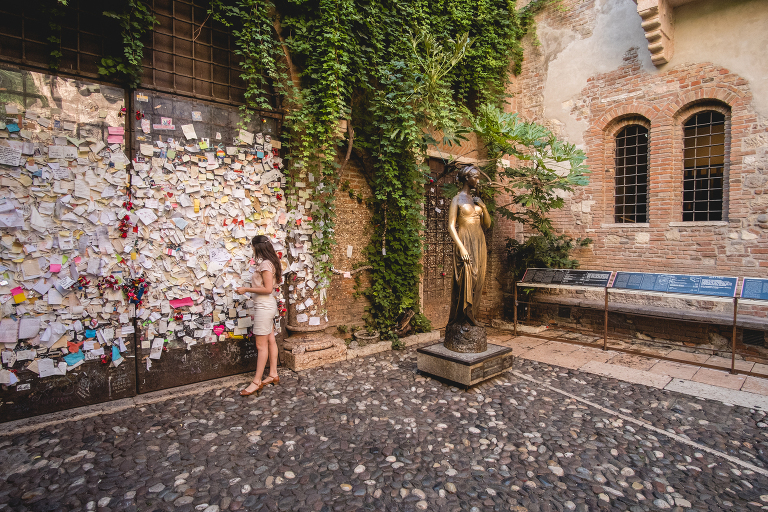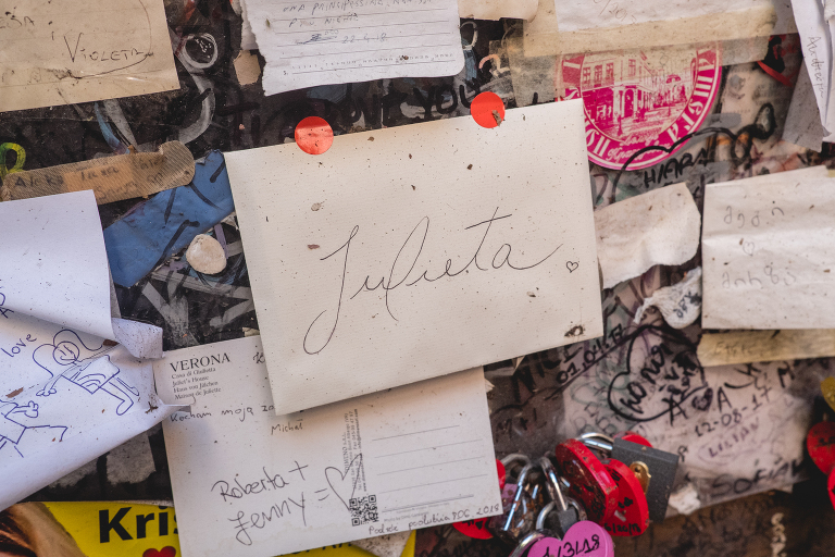 Matthew was still sleeping, but I was wide awake with anticipation. Casa Di Giulietta’s doors opened to visitors at eight and I knew that there would be a flock of visitors from all over the world waiting to leave their own letters to Juliet. Verona is the setting for Shakespeare’s famous play, Romeo and Juliet. Although fictional, Juliet’s house is believed to have belonged to her, or at least, been the home to a woman just like her. It is now a historical museum and people from every corner of the earth come to write letters to Juliet, asking for love advice. Juliet’s secretaries will write you back as long as you leave a return address.