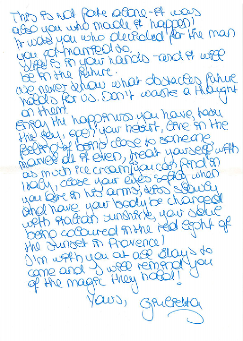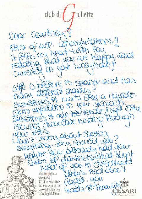 I would say that the letter was everything I needed to hear and was hoping for. It had a la dolce vita (the sweet life) message as well; appreciate what you have, make the most of every moment, and love with your whole heart.