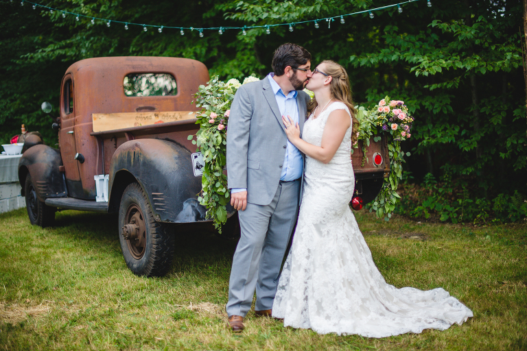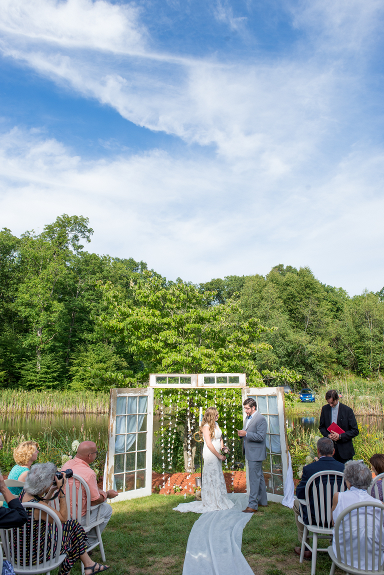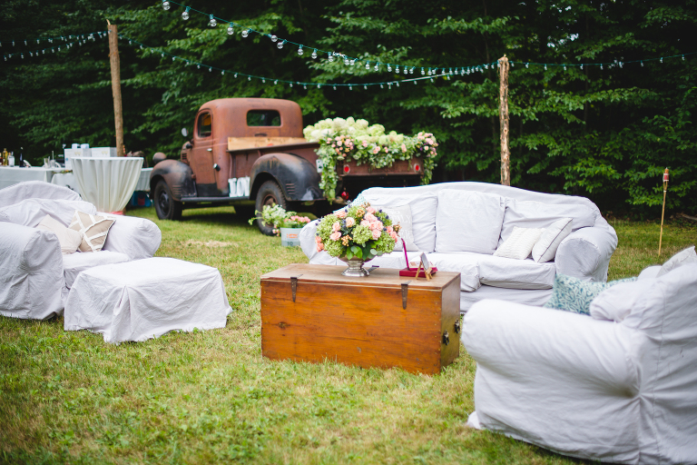 One of my favorite weddings was Anna and Andy’s backyard wedding which took place at Anna’s childhood home (pictured in this post). Anna and her family were so resourceful when pulling all of the details together. The altar was made from their old French doors and the ceremony chairs were from her grandmother’s attic. A tent and tables were rented, but the rest of the furniture came from their home, such as the sofas placed in the yard with homemade covers. Anna’s aunt and uncle let them borrow their old vintage pick up truck as a unique decoration. The tables were decorated with their family holiday cups holding flowers. Everything else was home made or rented. Use what you have. For our wedding this coming June, I am using my own tea cup collection (and teacups that I found used at Goodwill and flea markets) for a tea station instead of buying all new cups or renting fancier ones from a company.
