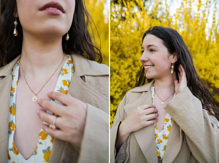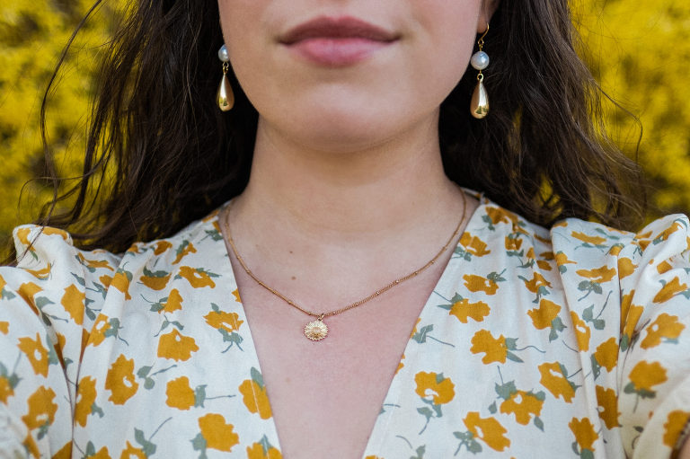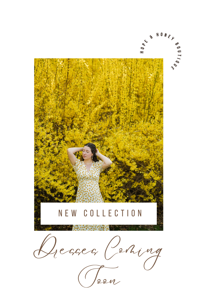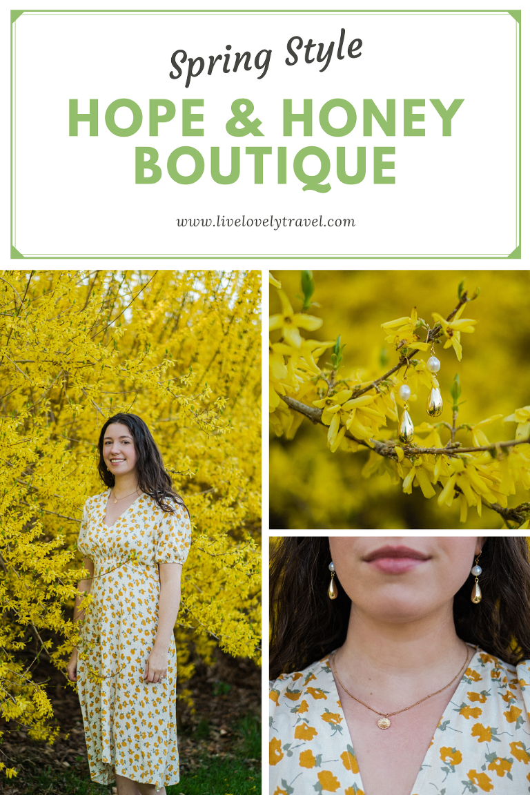 This beautiful spring floral dress with puff sleeves and a charming yellow print will be available at Hope & Honey by the end of spring. It is a perfect dress for spring that transitions beautifully into a summer dress for picnics and daily wear. These beautiful Atonement Design earrings and floral daisy necklace in gold are available at the Hope & Honey boutique right now along with a stunning collection of jewelry.