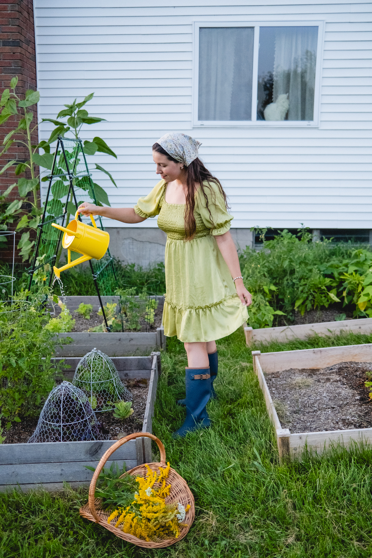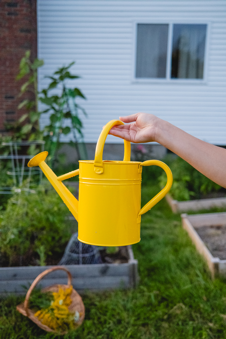 The best way to water a garden is to water it infrequently, but deeply to encourage the roots to go deeper into the soil. You will want to water your plants at the base. For this reason, I prefer to use a watering can.