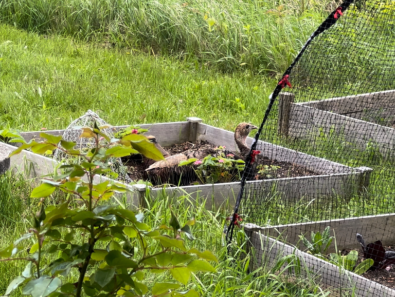 There are also numerous nets, cloches and pop-up screens you can put over certain plants to protect them. I have a pop-up screen for my lettuce and for my strawberry patch, although this year I was not fast enough putting it in place. I found a turkey nesting in my patch just the other day!