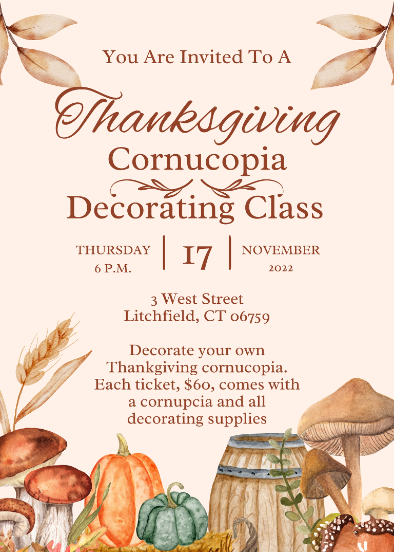 Last year I decorated a cornucopia of my very own for a Thanksgiving table centerpiece. Cornucopias are a beautiful and historic tradition and this year I have the honor of teaching a cornucopia decorating class at the Hope & Honey Boutique in Litchfield, Connecticut. If you have ever wanted to decorate one of your own, here is your chance.