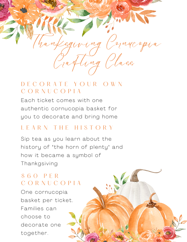Each ticket comes with an authentic 12″ cornucopia basket of your very own to decorate. All decorations are included from fake flowers and foliage to mini pumpkins, and dazzling decorations to fill your basket with. Sip some tea and eat some delicious autumnal treats as you learn about the history of “the horn of plenty” and decorate one of your very own to bring home for your Thanksgiving centerpiece. Families can decorate a cornucopia together or purchase additional tickets for extra cornucopia baskets. Each ticket is $60 and includes the cornucopia and all decorating supplies.