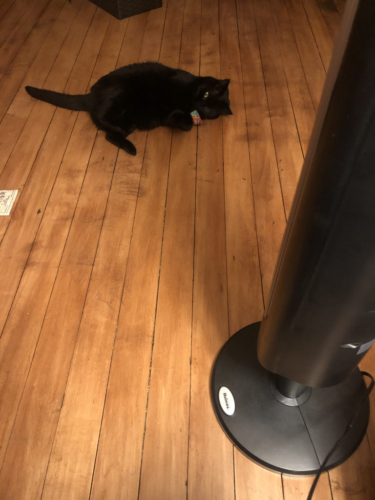 It has been scorching hot and we do not have AC. Madeleine is pictured here playing in front of the fan to cool off.