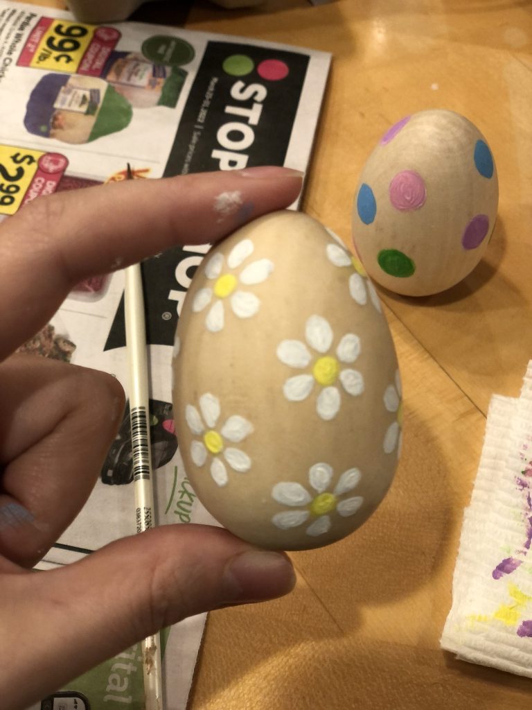 My mom and I do a bi-weekly art night, and one week we painted wooden eggs for Easter décor. It was much harder than it looked.