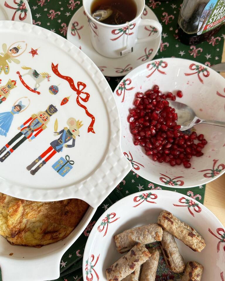 Christmas morning. We had a lovely breakfast of French toast casserole, sausage, and pomegranate with tea and Arethusa eggnog.