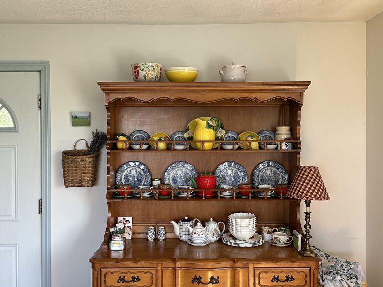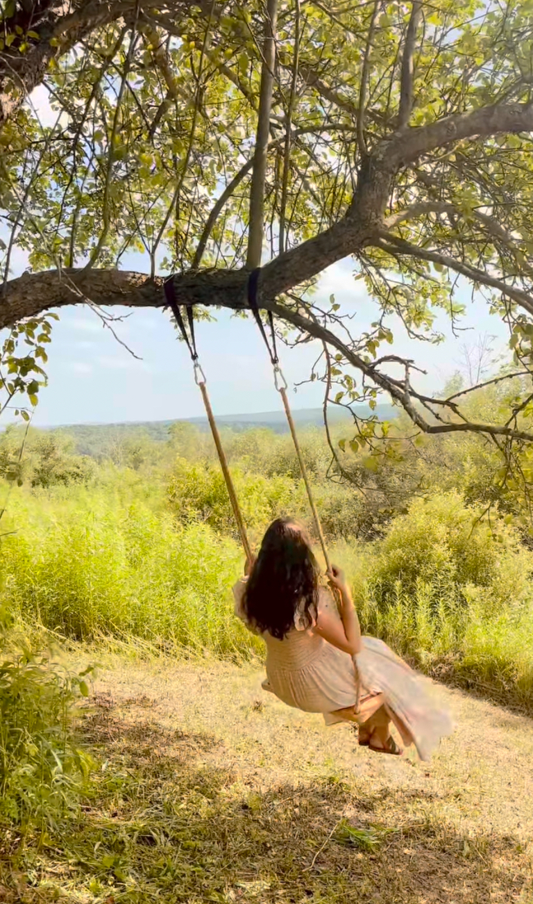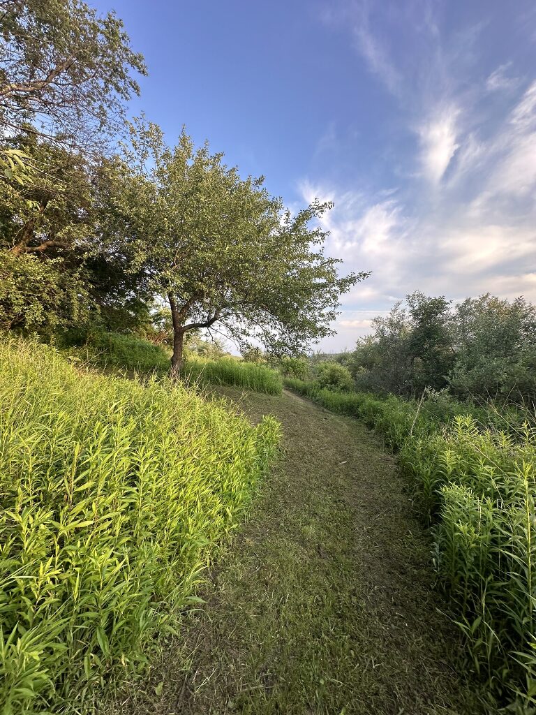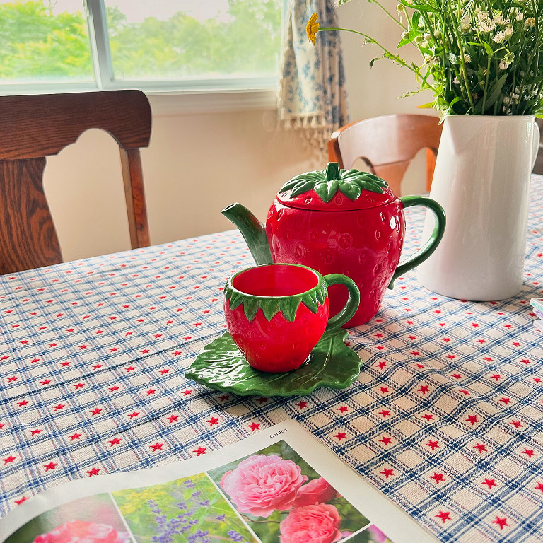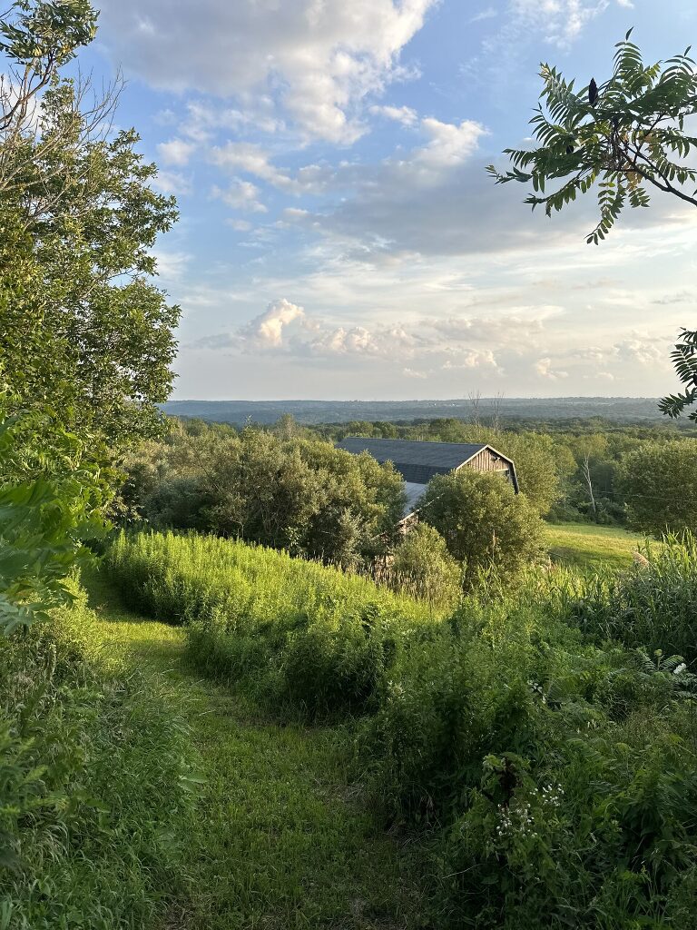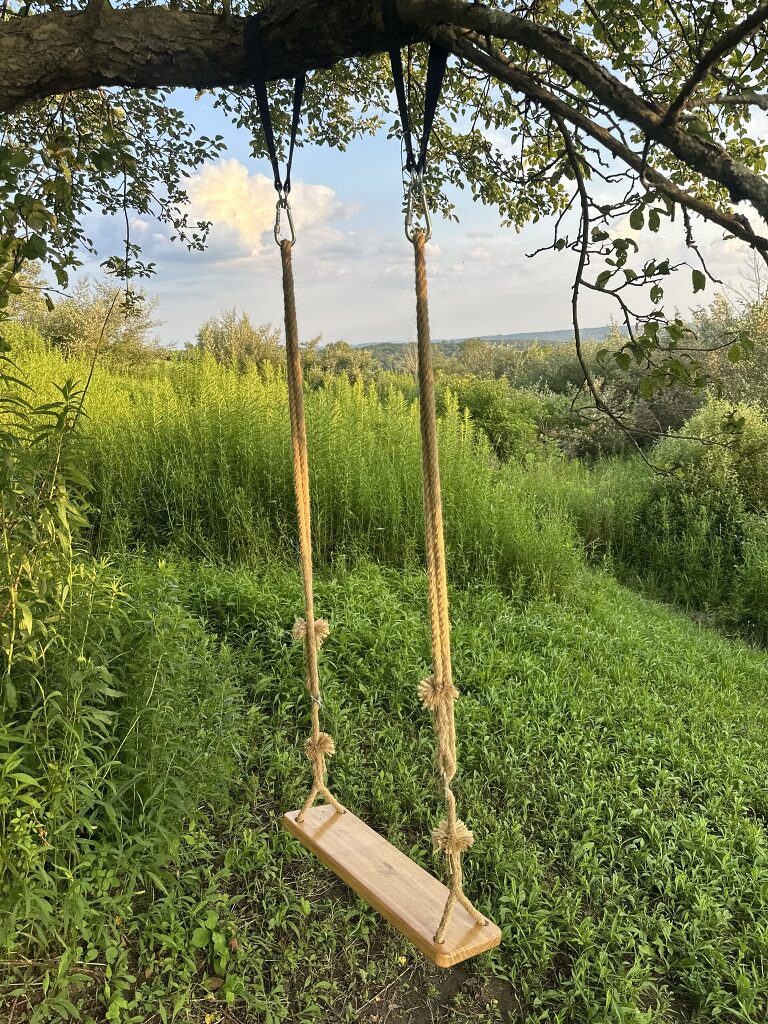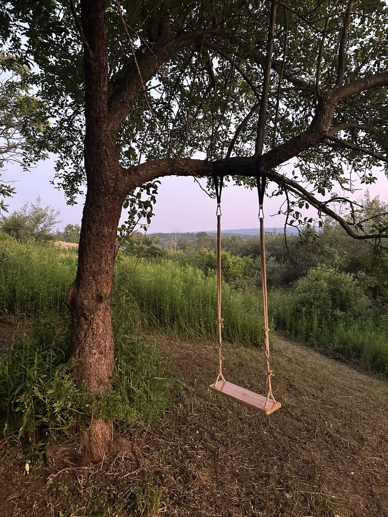 In early summer Matthew hung a swing in the back yard and my cousin Brian mowed pathways and trails through the property. I’ve nicknamed it our secret garden. I’m a children’s librarian and when I came home on a Saturday after our Summer Reading Festival, there was a swing hanging from the apple tree as a fun surprise. Some mornings I walk down the hill with my strawberry shaped teacup full of green tea and sit and sip.