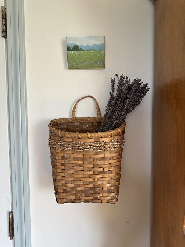 An oil painting I painted of Sugar Hill New Hampshire and a bowery basket full of lavender.