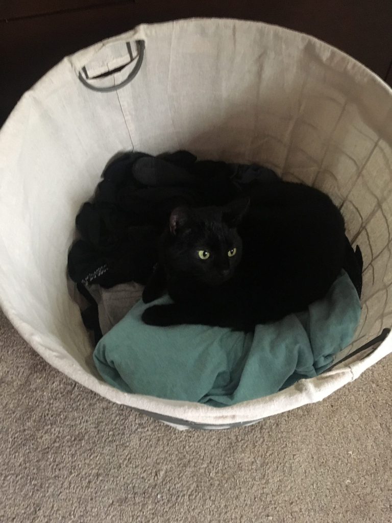 All week long she has been popping up in the most random places; laundry baskets, duffel bags, and hidden places around our tiny apartment. Usually you can find her on the sofa, on the bed, or the window sill but every day this week she has been finding a new place. She has been making us laugh all week with the places she manages to find.