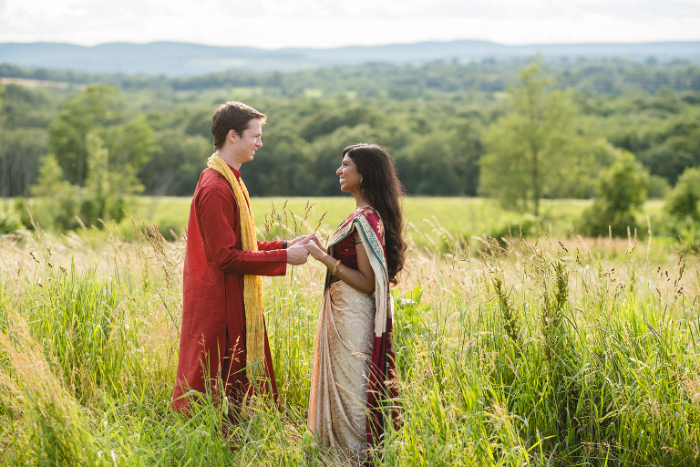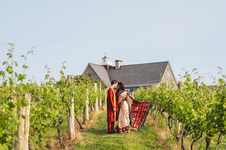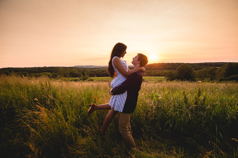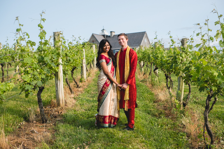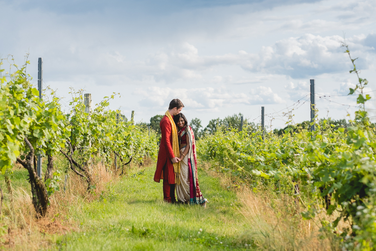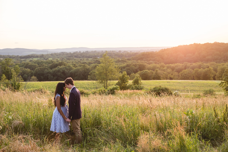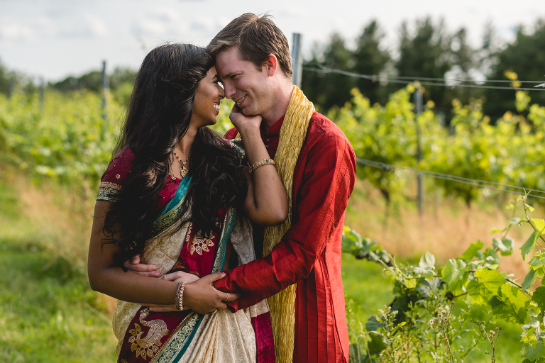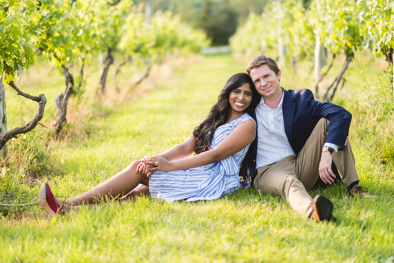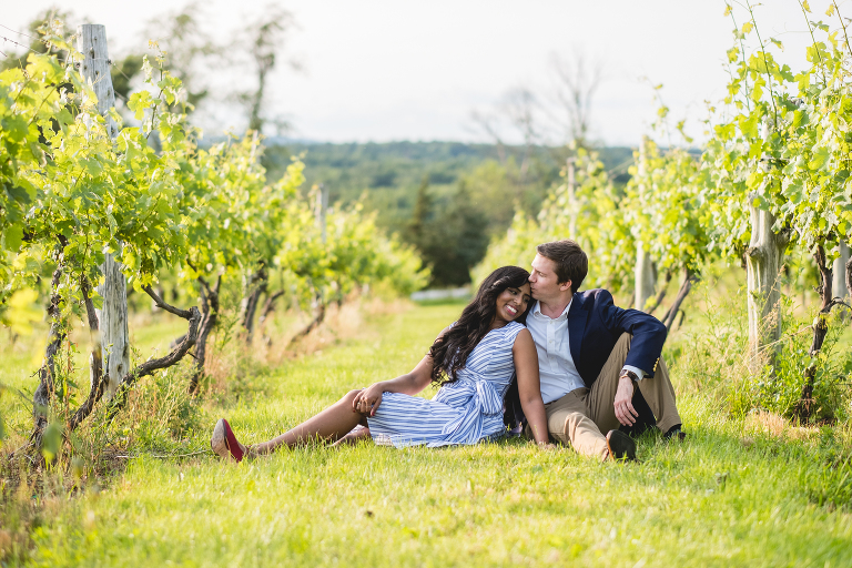 Thejal and Preston’s Connecticut vineyard engagement session looked like something out of a fairy tale. When we first arrived at the vineyard, dark clouds were rolling in and it began to rain down on us. Just moments later, the clouds quickly sailed away and bright sunshine painted the vineyard in shades of gold. With the rolling hills in the background, the location looked more like Tuscany than modest New England. I am still in awe over the beauty of the landscape, which compliments Thejal and Preston so well. I don’t know what was brighter; the gorgeous sunshine we had on that day or their love for one another. It absolutely radiants from within them in every photo we captured. I had the most difficult time selecting which photos to post because I loved them all so much! -I had to enlist my sister Jennifer’s help in picking out which ones to share with you today. These are our favorite images from Thejal and Preston’s summer vineyard engagement session.