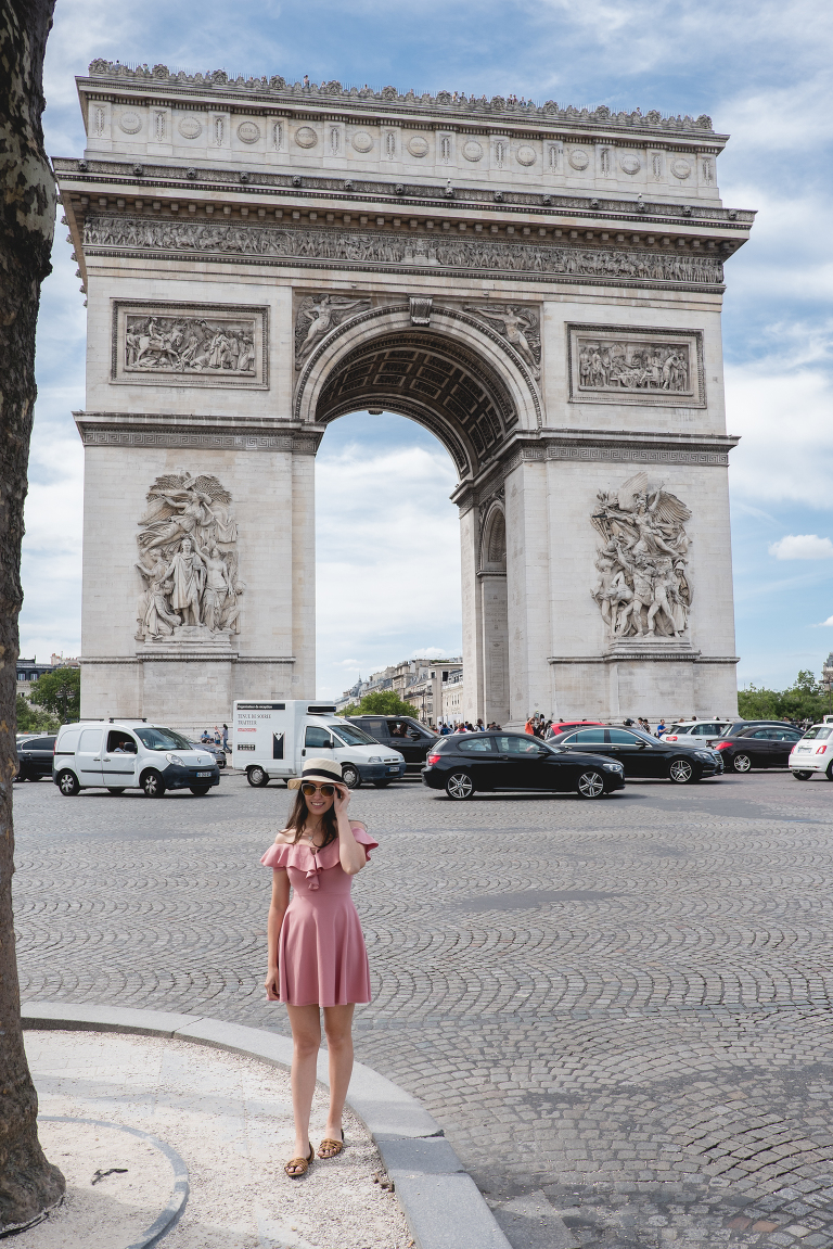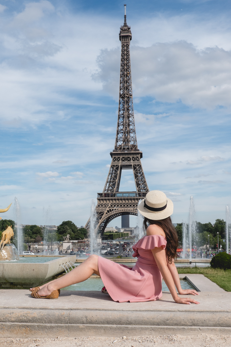 For a sunny day at the Eiffel Tower sunglasses or a simple sunhat are essential. I wore a pink A-line dress with off-the-shoulder ruffles at the top with simple brown sandals. .jpg)